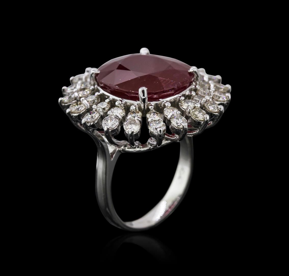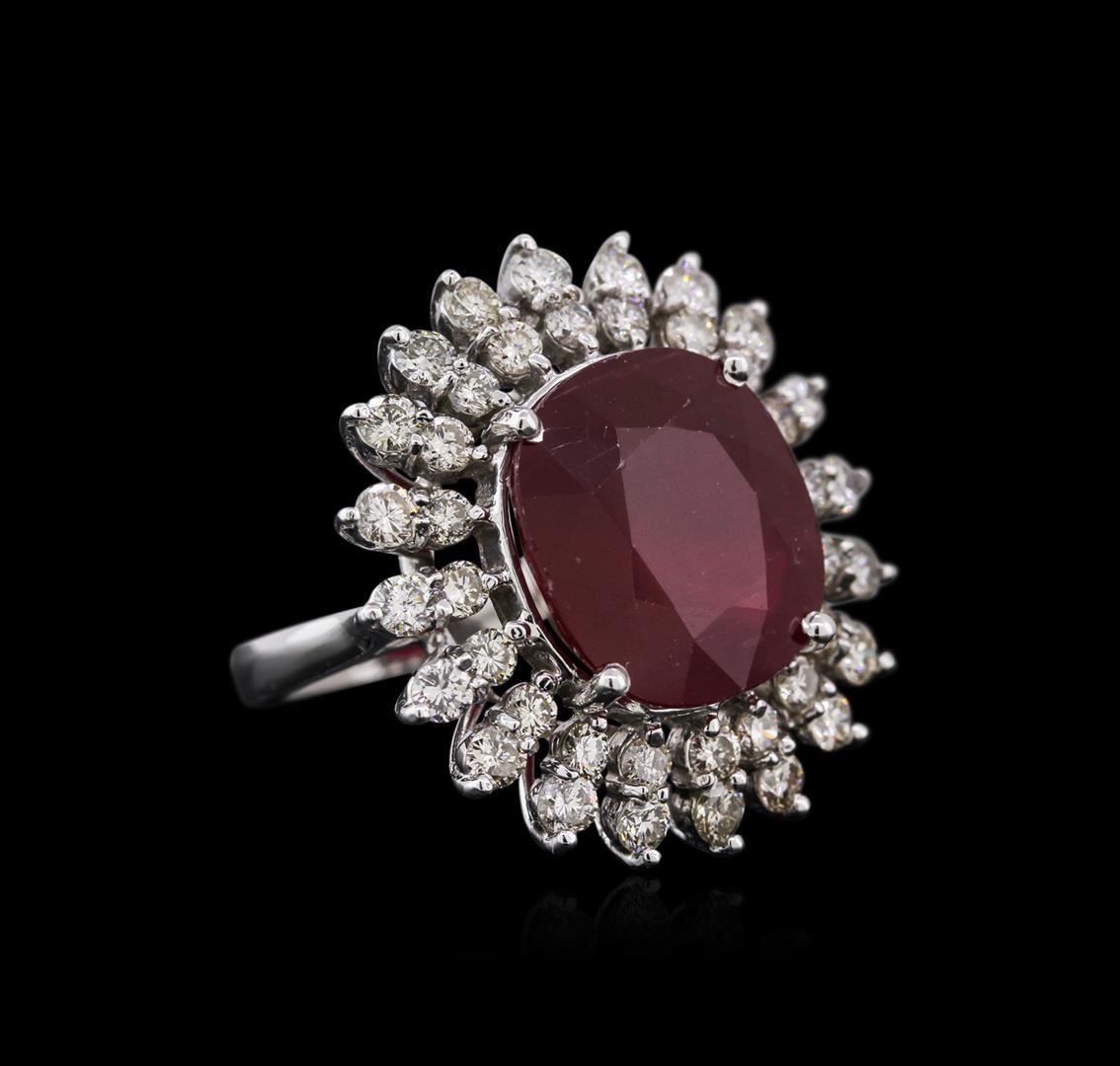 One electronically tested 14KT white gold ladies cast ruby and diamond ring with a cathedral shank with a bright polish finish. Identified with markings of "K14". Condition is new. Containing: One prong set square cushion modified brilliant cut natural ruby, measuring 14.51 x 13.84 x 7.74mm, approximate weight of 14.62ct., clarity is heavily included, type II, medium dark, very slightly brownish, strongly purplish red color, (GIA stpR 6/3), cut is good. Twenty prong set round brilliant cut diamonds, measuring 2.50 - 2.50 x 1.50mm (depth est.) approximate total weight of 20 Stones = 1.14ct. Clarity: SI-1 to SI-2. Color: I - J, Cut is Good. Twenty prong set round brilliant cut diamonds, measuring 2.00 - 2.00 x 1.20mm (depth est.) approximate total weight of 20 Stones = 0.58ct. Clarity: SI-1 to SI-2. Color: I - J, Cut is Good. Colored gemstones are presumed to have been subjected to commonly used enhancement processes. Diamonds and colored gemstones are graded in the mounting, unless otherwise stated. Total Weight of Colored Stones 14.62ct. Total Weight of Diamonds 1.73ct. Total Weight of Ring 11.30 grams. GGL Appraised at $5,370.00.