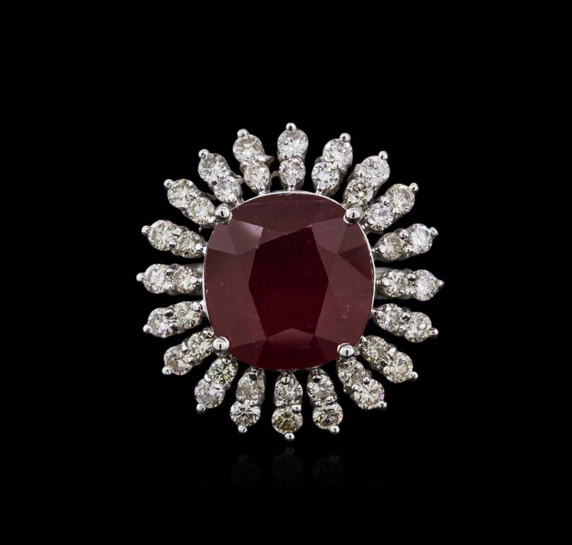 One electronically tested 14KT white gold ladies cast ruby and diamond ring with a cathedral shank with a bright polish finish. Identified with markings of "K14". Condition is new. Containing: One prong set square cushion modified brilliant cut natural ruby, measuring 14.51 x 13.84 x 7.74mm, approximate weight of 14.62ct., clarity is heavily included, type II, medium dark, very slightly brownish, strongly purplish red color, (GIA stpR 6/3), cut is good. Twenty prong set round brilliant cut diamonds, measuring 2.50 - 2.50 x 1.50mm (depth est.) approximate total weight of 20 Stones = 1.14ct. Clarity: SI-1 to SI-2. Color: I - J, Cut is Good. Twenty prong set round brilliant cut diamonds, measuring 2.00 - 2.00 x 1.20mm (depth est.) approximate total weight of 20 Stones = 0.58ct. Clarity: SI-1 to SI-2. Color: I - J, Cut is Good. Colored gemstones are presumed to have been subjected to commonly used enhancement processes. Diamonds and colored gemstones are graded in the mounting, unless otherwise stated. Total Weight of Colored Stones 14.62ct. Total Weight of Diamonds 1.73ct. Total Weight of Ring 11.30 grams. GGL Appraised at $5,370.00.