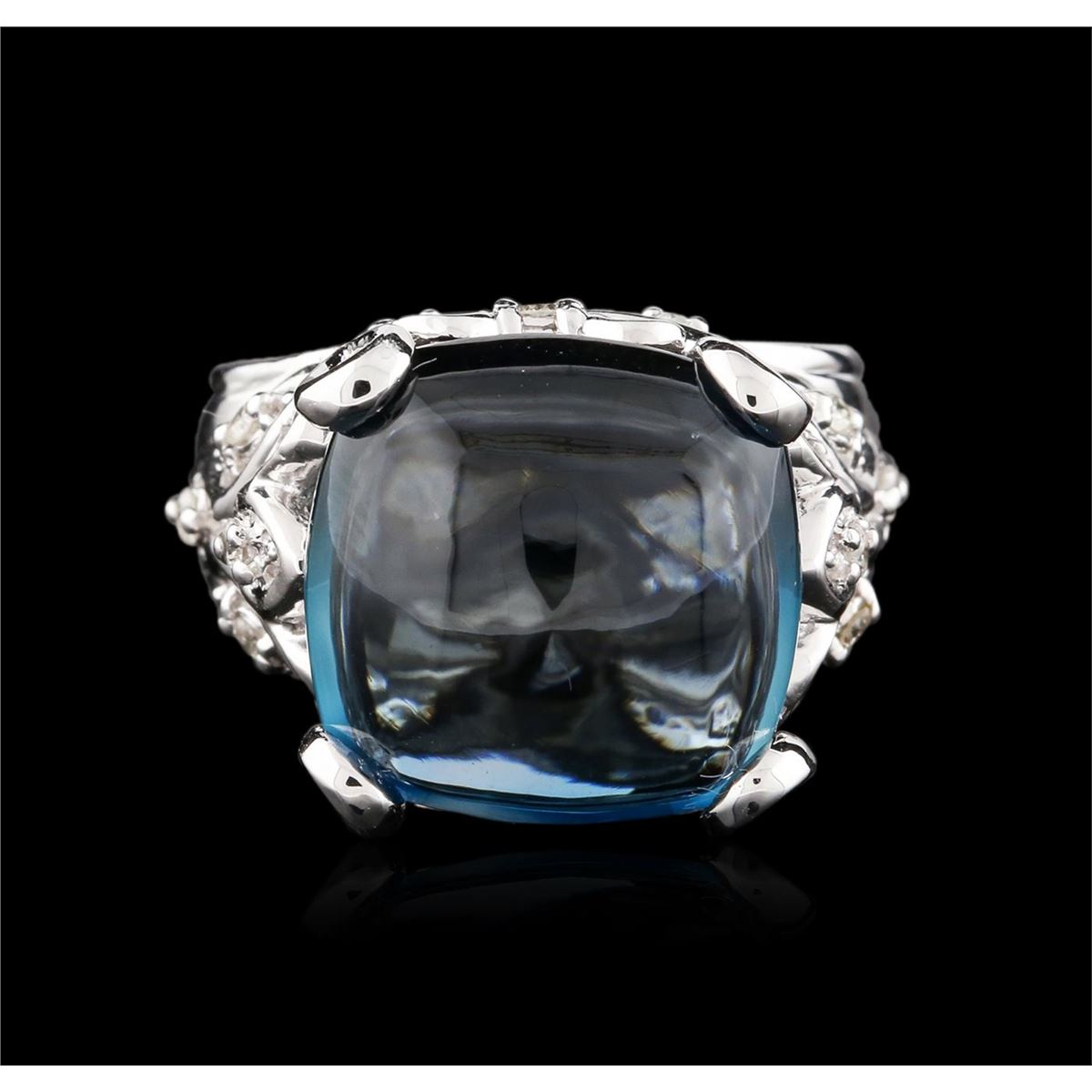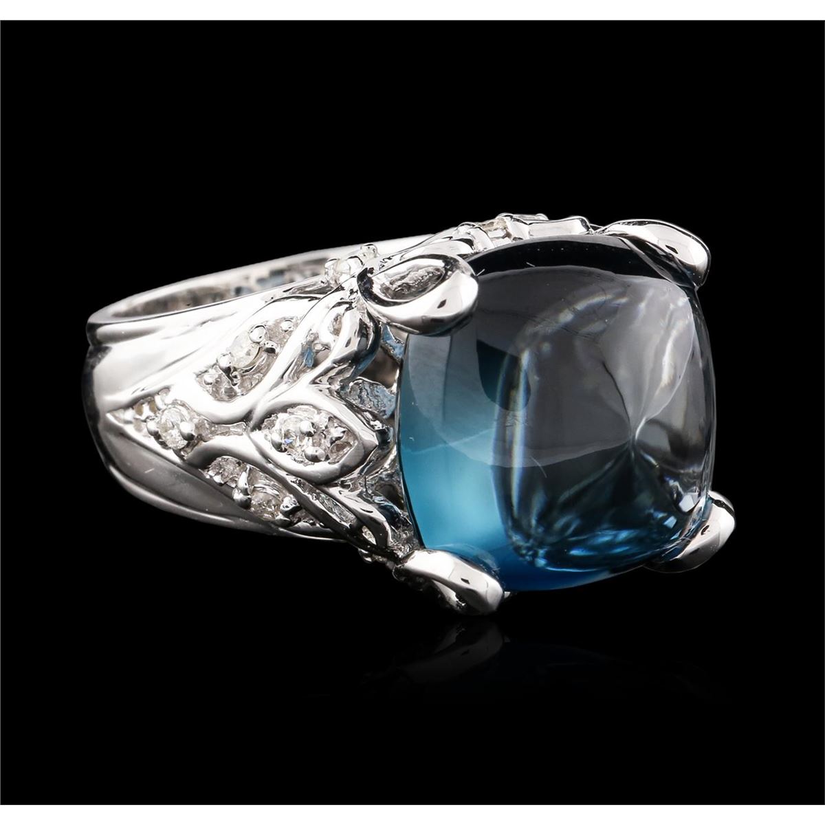 One ring featuring: 14KT white gold weighing 12.90 grams containing one blue topaz center stone with a total weight of 14.69ct and diamonds with a total weight of 0.28ct.
