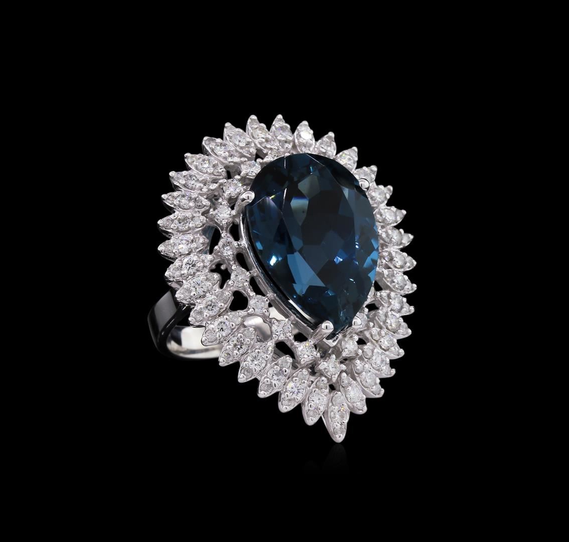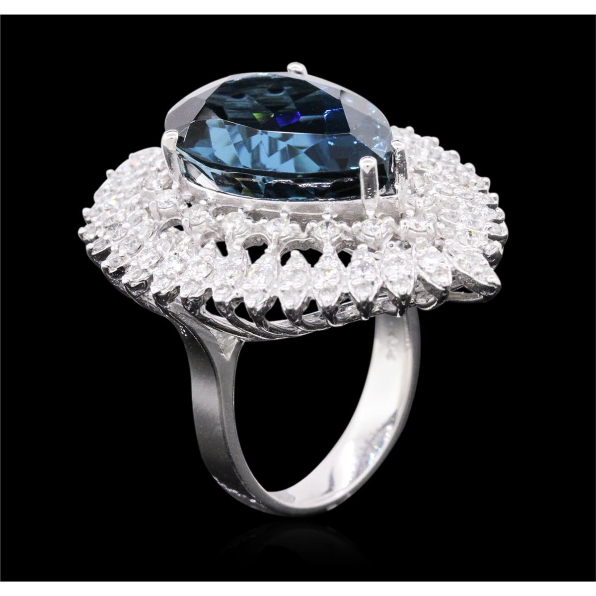 One electronically tested 14KT white gold ladies cast topaz and diamond ring with a bright polish finish. Identified with markings of "14K". Condition is new. Containing: One prong set oval modified brilliant cut natural blue topaz, measuring 18.34 x 12.91 x 8.39mm, approximate weight of 14.73ct., clarity is eye clean, type I, medium dark, moderately strong, greenish blue color, (GIA gB 6/4), cut is good. One Hundred Ten prong set round brilliant cut diamonds, measuring 1.80 - 1.30 x 0.93mm (depth est.) approximate total weight of 110 Stones = 1.50ct. Clarity: SI-1 to I-1. Color: I - J, Cut is Good. Colored gemstones are presumed to have been subjected to commonly used enhancement processes. All diamonds and colored gemstones are graded in the mounting, unless otherwise stated. Total Weight of Colored Stones 14.73ct. Total Weight of Diamonds 1.50ct. Total Weight of Ring 13.80 grams. GGL Appraised at $5,195.00.