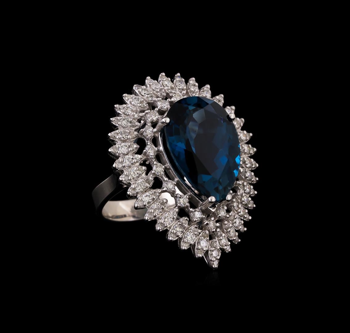 One electronically tested 14KT white gold ladies cast topaz and diamond ring with a bright polish finish. Identified with markings of "14K". Condition is new. Containing: One prong set oval modified brilliant cut natural blue topaz, measuring 18.34 x 12.91 x 8.39mm, approximate weight of 14.73ct., clarity is eye clean, type I, medium dark, moderately strong, greenish blue color, (GIA gB 6/4), cut is good. One Hundred Ten prong set round brilliant cut diamonds, measuring 1.80 - 1.30 x 0.93mm (depth est.) approximate total weight of 110 Stones = 1.50ct. Clarity: SI-1 to I-1. Color: I - J, Cut is Good. Colored gemstones are presumed to have been subjected to commonly used enhancement processes. All diamonds and colored gemstones are graded in the mounting, unless otherwise stated. Total Weight of Colored Stones 14.73ct. Total Weight of Diamonds 1.50ct. Total Weight of Ring 13.80 grams. GGL Appraised at $5,195.00.