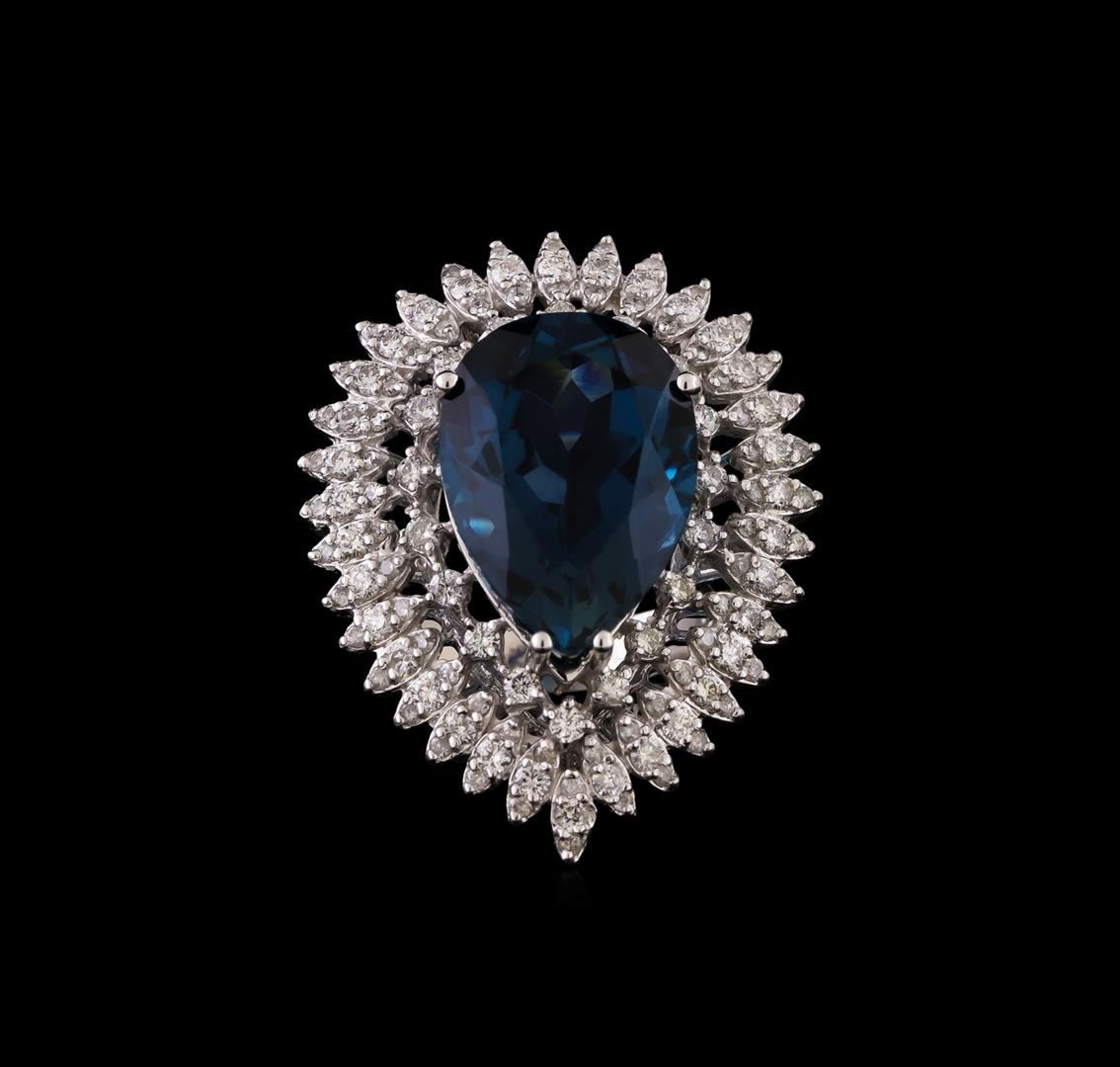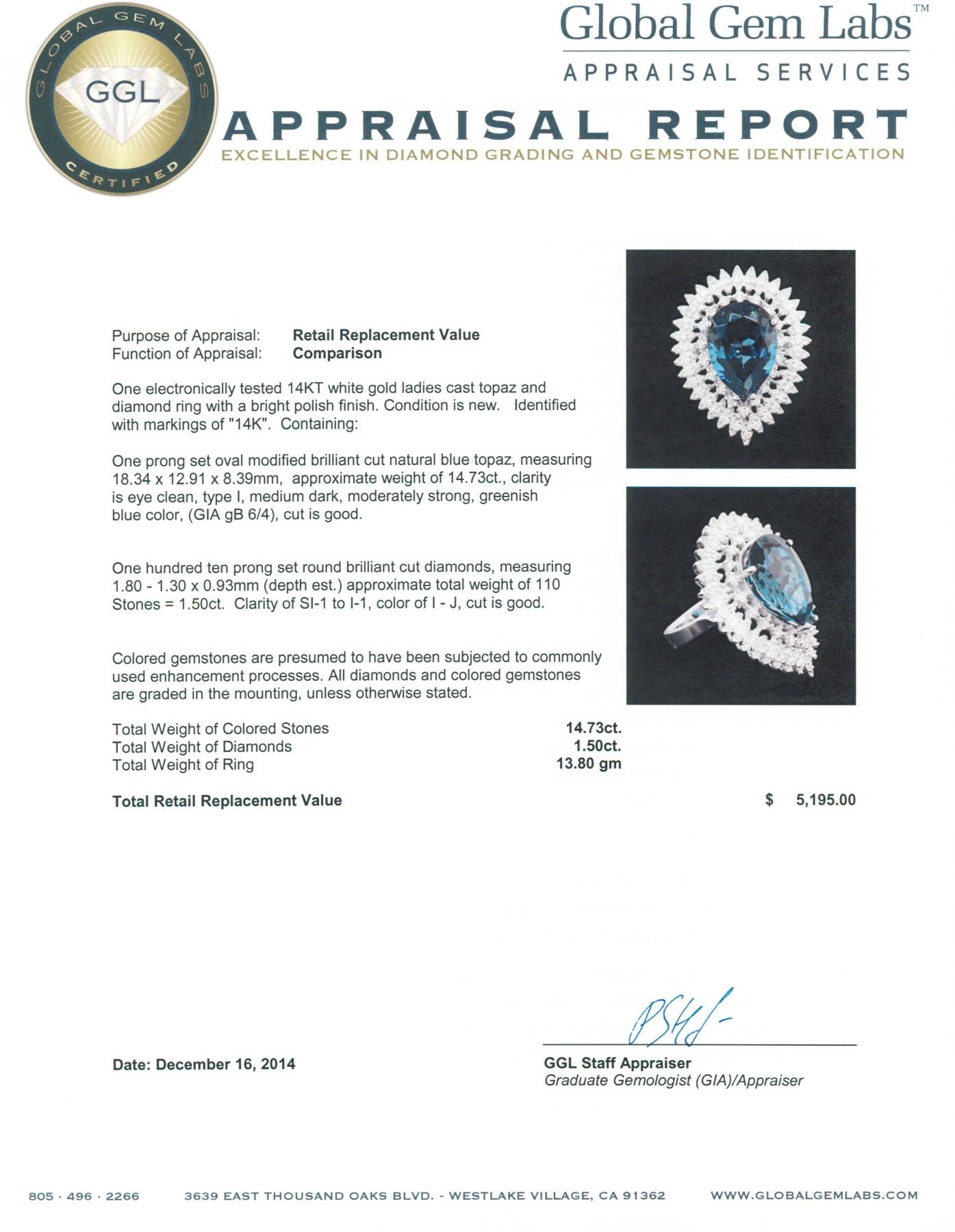 One electronically tested 14KT white gold ladies cast topaz and diamond ring with a bright polish finish. Identified with markings of "14K". Condition is new. Containing: One prong set oval modified brilliant cut natural blue topaz, measuring 18.34 x 12.91 x 8.39mm, approximate weight of 14.73ct., clarity is eye clean, type I, medium dark, moderately strong, greenish blue color, (GIA gB 6/4), cut is good. One Hundred Ten prong set round brilliant cut diamonds, measuring 1.80 - 1.30 x 0.93mm (depth est.) approximate total weight of 110 Stones = 1.50 ct. Clarity: SI-1 to I-1. Color: I - J, Cut is Good. Colored gemstones are presumed to have been subjected to commonly used enhancement processes. All diamonds and colored gemstones are graded in the mounting, unless otherwise stated. Total Weight of Colored Stones 14.73ct. Total Weight of Diamonds 1.50 ct. Total Weight of Ring 13.80 grams. GGL Appraised.