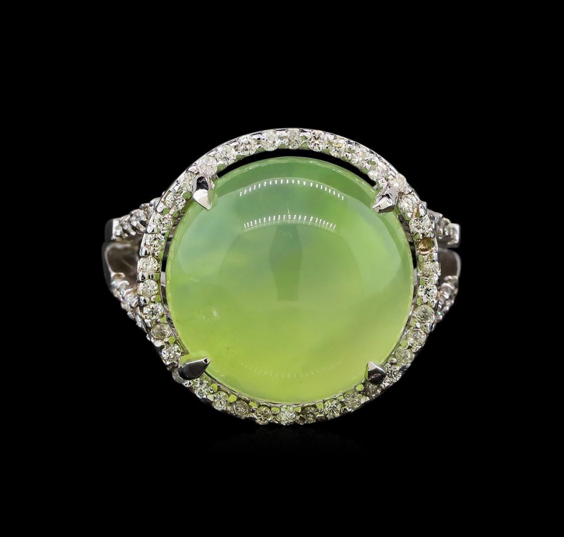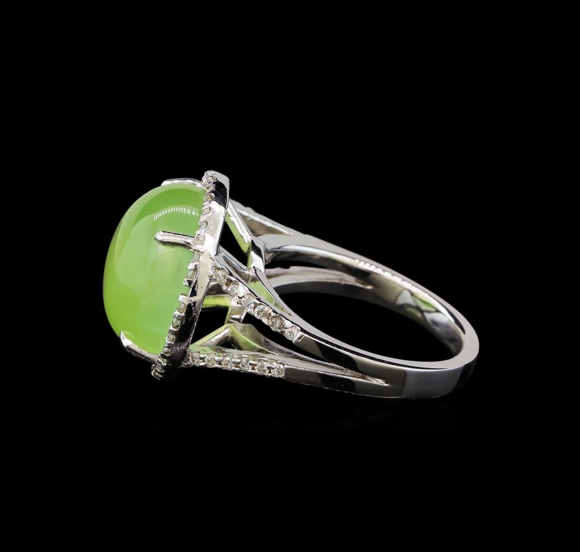 One electronically tested 14KT white gold ladies cast tourmaline and diamond ring with a bright polish finish. Identified with markings of "14K". Condition is new. Containing: One prong set round cabochon cut natural green tourmaline, measuring 14.00. x 14.00. x 9.10mm, approximate weight of 14.74ct., clarity is heavily included, type I, light, very slightly grayish, green color, (GIA G 3/3), cut is good. Fifty-Nine prong set round brilliant cut diamonds, measuring 1.30 - 1.30 x 0.78mm (depth est.) approximate total weight of 59 Stones = 0.47ct. Clarity: SI-2 to I-2. Color: I - J, Cut is Good. Colored gemstones are presumed to have been subjected to commonly used enhancement processes. All diamonds and colored gemstones are graded in the mounting, unless otherwise stated. Total Weight of Colored Stones 14.74ct. Total Weight of Diamonds 0.47ct. Total Weight of Ring 8.10 grams. GGL Appraised at $3,595.00.