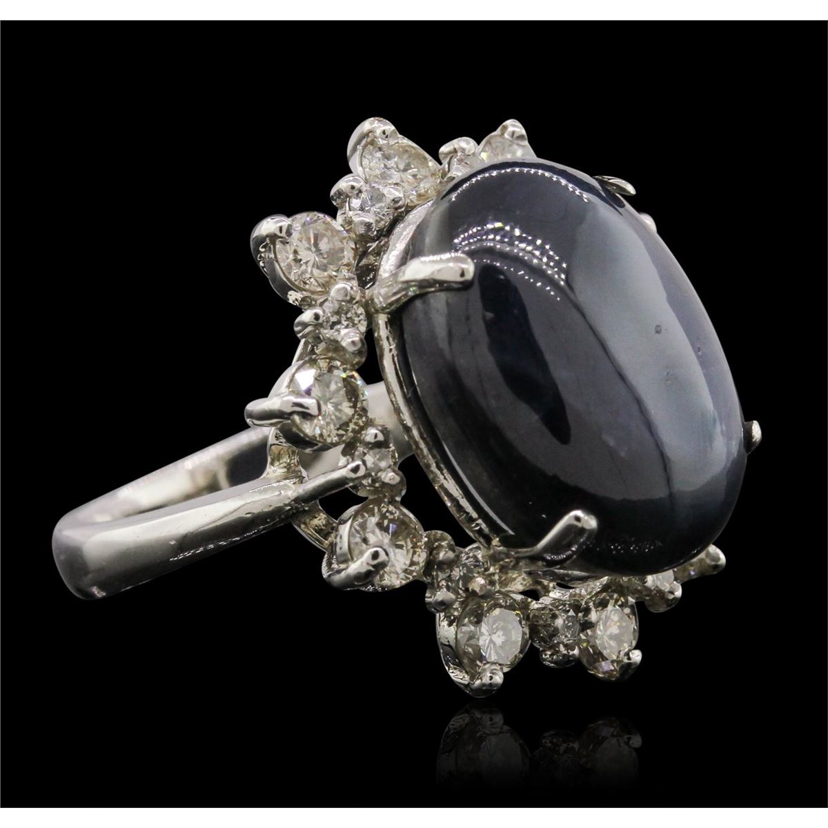 One electronically tested 14KT white gold Ladies combination cast & assembled ring with a bright polish finish. Condition is new. Identified with markings of "K14". Containing: One prong set oval cabochon cut natural star sapphire, measuring 16.20 x 12.00 x 7.02mm, approximate weight of 14.74ct., clarity is heavily included, medium dark, moderately strong, blue color, (GIA B 6/4), cut is good. This stone has a partly complete four ray star with weak intensity and fair movement. Colored gemstones are presumed to have been subjected to commonly used color/clarity enhancement processes. Ten prong set round brilliant cut diamonds, measuring 3.20 - 3.20 x 1.92mm (depth est.) approximate total weight of 10 Stones = 1.20ct. Clarity of I-1, Color of K - L, Cut is Good. Ten prong set round brilliant cut diamonds, measuring 1.60 - 1.60 x 0.96mm (depth est.) approximate total weight of 10 Stones = 0.15ct. Clarity of I-1, Color of K - L, Cut is Good. Total Weight of Colored Stones 14.74ct. Total Weight of Diamonds 1.35ct. Total Weight of Ring 9.60 grams. GGL Appraised at $6,895.00.
