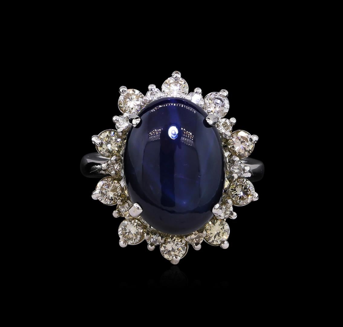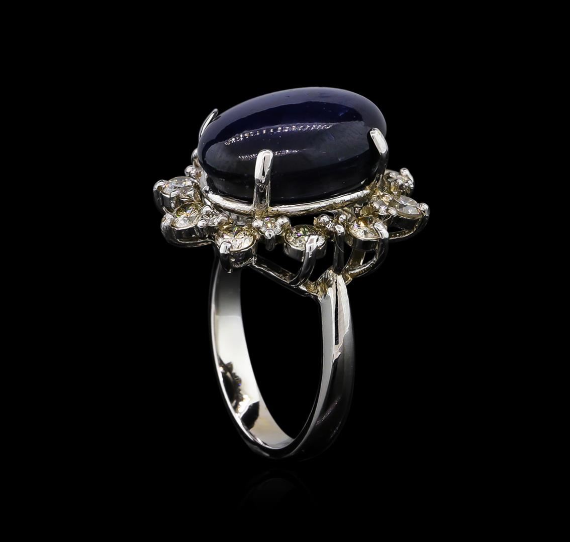 One electronically tested 14KT white gold Ladies combination cast & assembled ring with a bright polish finish. Condition is new. Identified with markings of "K14". Containing: One prong set oval cabochon cut natural star sapphire, measuring 16.20 x 12.00 x 7.02mm, approximate weight of 14.74ct., clarity is heavily included, medium dark, moderately strong, blue color, (GIA B 6/4), cut is good. This stone has a partly complete four ray star with weak intensity and fair movement. Colored gemstones are presumed to have been subjected to commonly used color/clarity enhancement processes. Ten prong set round brilliant cut diamonds, measuring 3.20 - 3.20 x 1.92mm (depth est.) approximate total weight of 10 Stones = 1.20ct. Clarity of I-1, Color of K - L, Cut is Good. Ten prong set round brilliant cut diamonds, measuring 1.60 - 1.60 x 0.96mm (depth est.) approximate total weight of 10 Stones = 0.15ct. Clarity of I-1, Color of K - L, Cut is Good. Total Weight of Colored Stones 14.74ct. Total Weight of Diamonds 1.35ct. Total Weight of Ring 9.60 grams. GGL Appraised at $6,895.00.