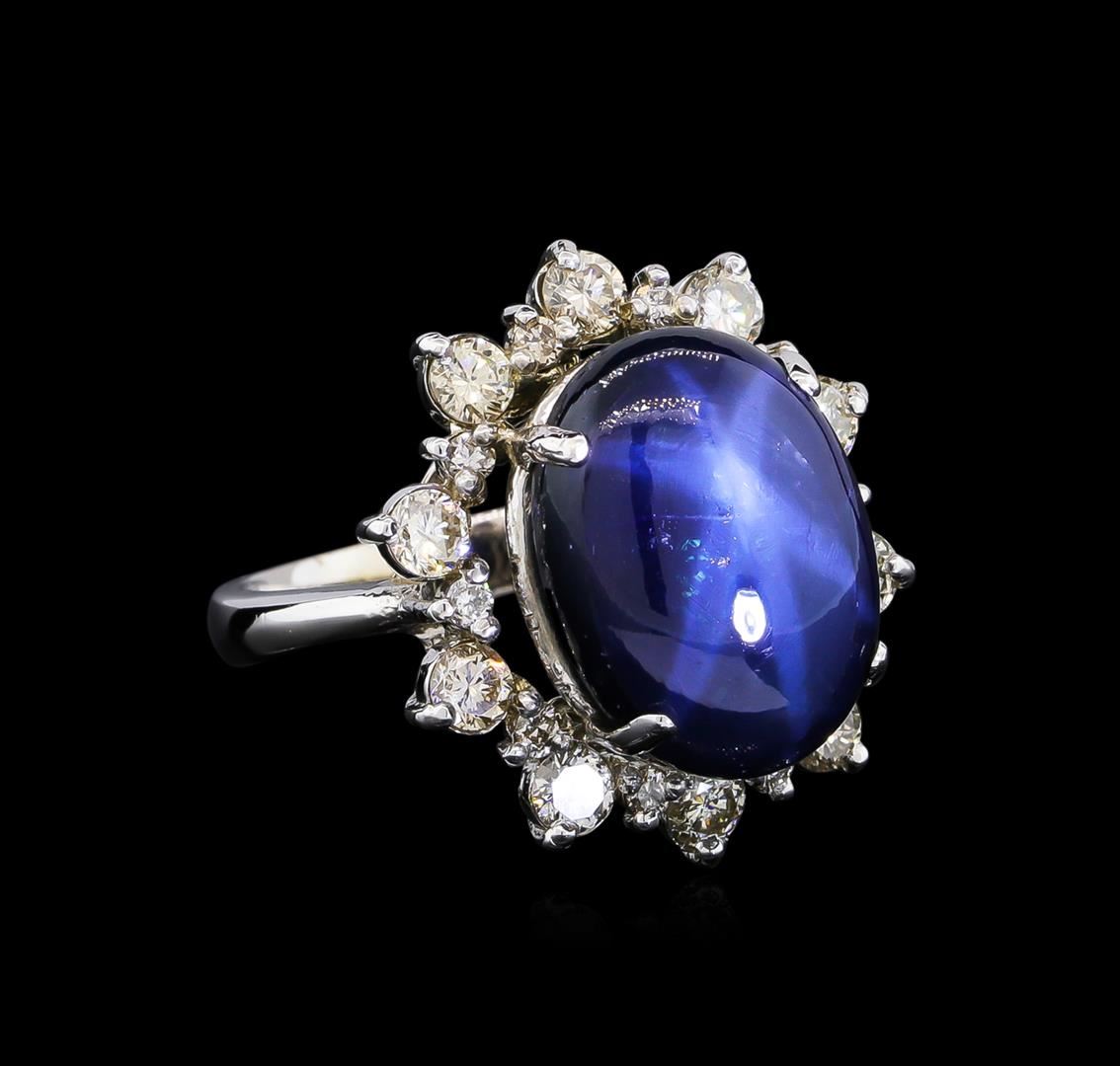 One electronically tested 14KT white gold Ladies combination cast & assembled ring with a bright polish finish. Condition is new. Identified with markings of "K14". Containing: One prong set oval cabochon cut natural star sapphire, measuring 16.20 x 12.00 x 7.02mm, approximate weight of 14.74ct., clarity is heavily included, medium dark, moderately strong, blue color, (GIA B 6/4), cut is good. This stone has a partly complete four ray star with weak intensity and fair movement. Colored gemstones are presumed to have been subjected to commonly used color/clarity enhancement processes. Ten prong set round brilliant cut diamonds, measuring 3.20 - 3.20 x 1.92mm (depth est.) approximate total weight of 10 Stones = 1.20ct. Clarity of I-1, Color of K - L, Cut is Good. Ten prong set round brilliant cut diamonds, measuring 1.60 - 1.60 x 0.96mm (depth est.) approximate total weight of 10 Stones = 0.15ct. Clarity of I-1, Color of K - L, Cut is Good. Total Weight of Colored Stones 14.74ct. Total Weight of Diamonds 1.35ct. Total Weight of Ring 9.60 grams. GGL Appraised at $6,895.00.