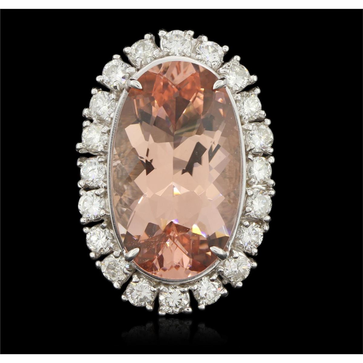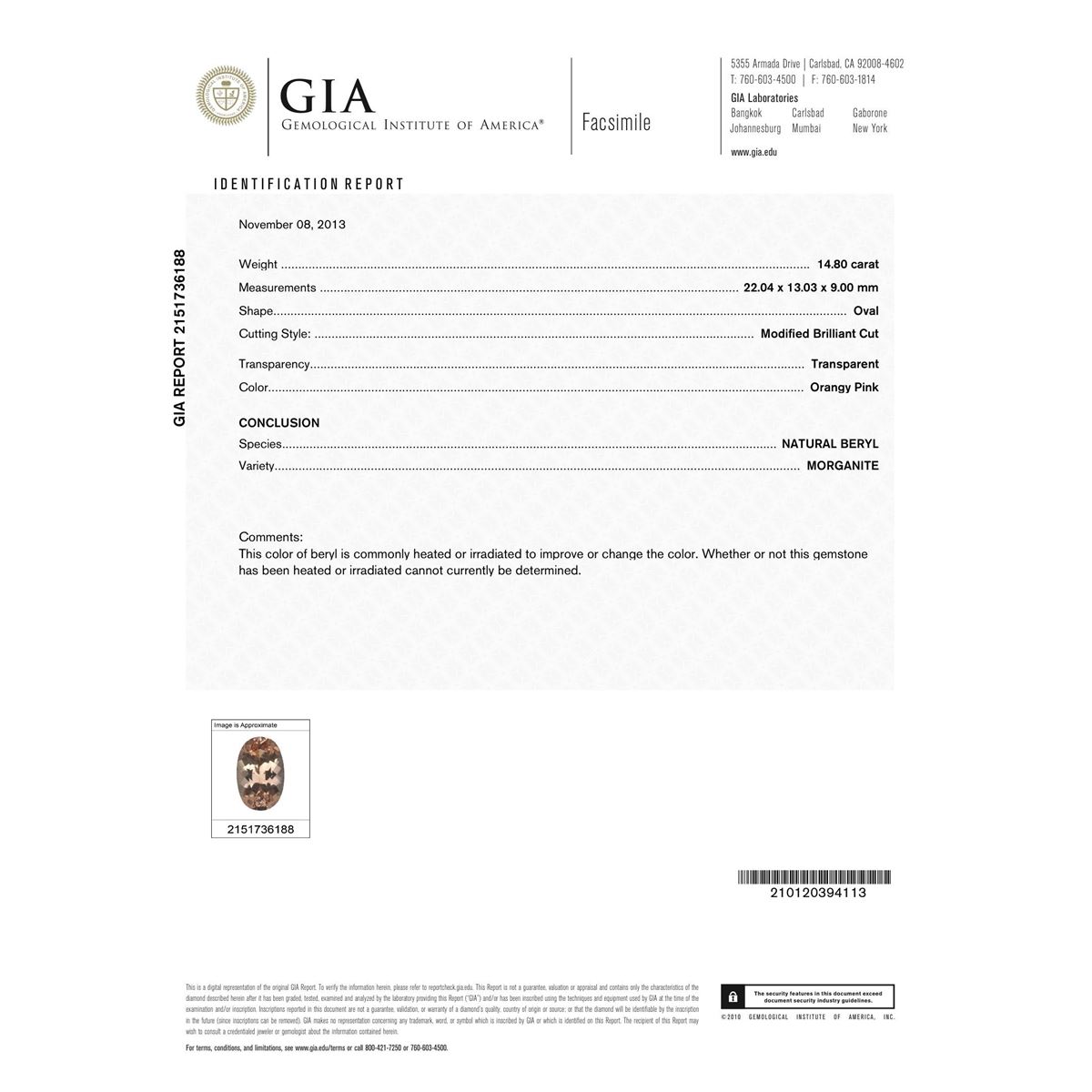One electronically tested 14KT white gold ladies cast morganite and diamond ring with a bright polish finish. The featured morganite is set within a diamond bezel supported by a lattice under gallery, completed by a two and one-half millimeter wide band. Identified with markings of "14K". Condition is new, good workmanship. Containing: One prong set oval modified brilliant cut natural morganite, measuring 22.04 x 13.03 x 9.00mm, exact weight 14.80ct., clarity is eye clean, type I, medium light, very slightly brownish, orangy pink color, (GIA oP), cut is good. Transmitting light with no distortion, transparent. GIA Colored Stone Grading Report attached. Graded loose prior to setting in the GIA Laboratory, Report #2151736188. Twenty prong set round brilliant cut diamonds, measuring 3.00 - 2.90 x 1.77mm (depth est.) approximate total weight of 20 Stones = 1.95ct. Graded in the setting. Clarity SI-1 to I-1. Color H - J. Total Weight of Colored Stones 14.80 ct. Total Weight of Diamonds 1.95ct. Total Weight of Ring 12.20gm. AIG Appraised at $17,620.00.