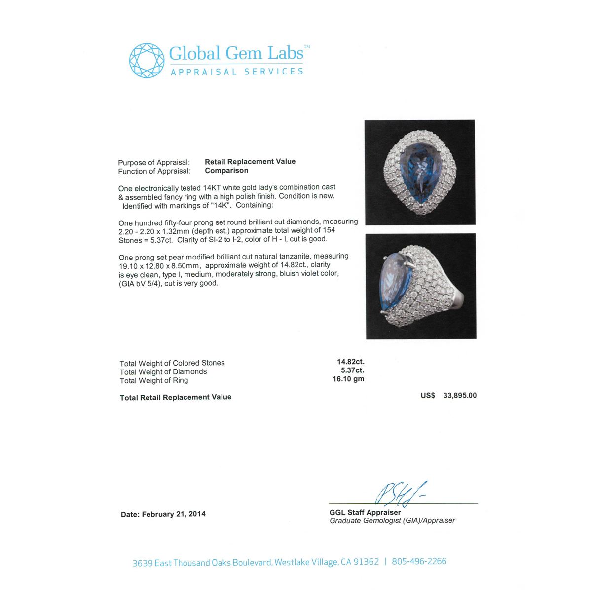 One electronically tested 14KT white gold Ladies combination cast & assembled fancy ring with a high polish finish. Condition is new. Identified with markings of "14K". Containing: One Hundred Fifty-Four prong set round brilliant cut diamonds, measuring 2.20 - 2.20 x 1.32mm (depth est.) approximate. Total Weight of 154 Stones = 5.37ct. Clarity: SI-2 to I-2. Color: H - I, Cut is Good. One prong set pear modified brilliant cut natural tanzanite, measuring 19.10 x 12.80 x 8.50mm, approximate weight of 14.82ct., clarity is eye clean, type I, medium, moderately strong, bluish violet color, (GIA bV 5/4), cut is very good. GIA Report: 2151964685.Total Weight of Colored Stones 14.82ct. Total Weight of Diamonds 5.37ct. Total Weight of Ring 16.10 grams. GGL Appraised at $33,895.00.