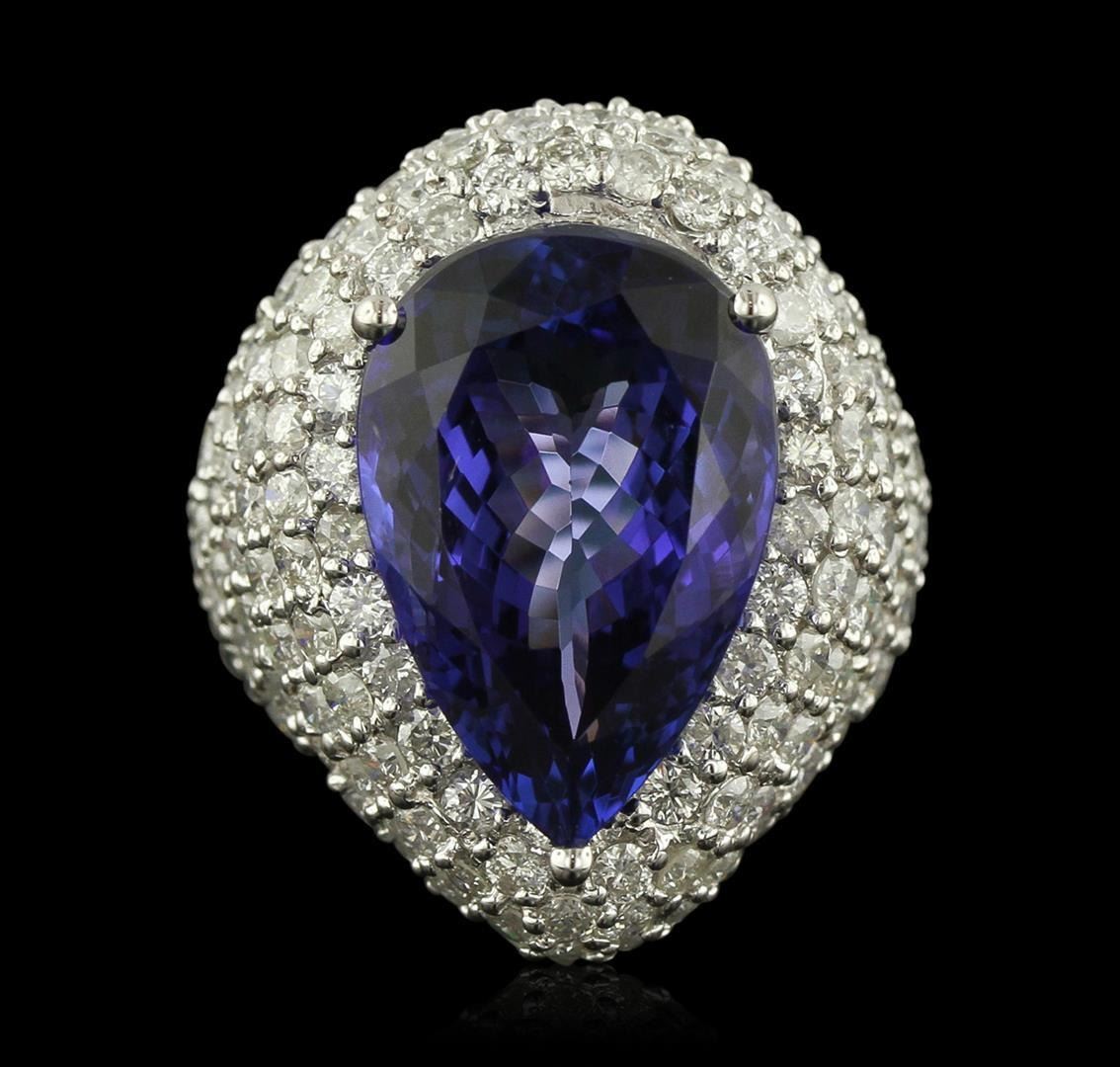 One electronically tested 14KT white gold Ladies combination cast & assembled fancy ring with a high polish finish. Condition is new. Identified with markings of "14K". Containing: One Hundred Fifty-Four prong set round brilliant cut diamonds, measuring 2.20 - 2.20 x 1.32mm (depth est.) approximate. Total Weight of 154 Stones = 5.37ct. Clarity: SI-2 to I-2. Color: H - I, Cut is Good. One prong set pear modified brilliant cut natural tanzanite, measuring 19.10 x 12.80 x 8.50mm, approximate weight of 14.82ct., clarity is eye clean, type I, medium, moderately strong, bluish violet color, (GIA bV 5/4), cut is very good. GIA Report: 2151964685.Total Weight of Colored Stones 14.82ct. Total Weight of Diamonds 5.37ct. Total Weight of Ring 16.10 grams. GGL Appraised.