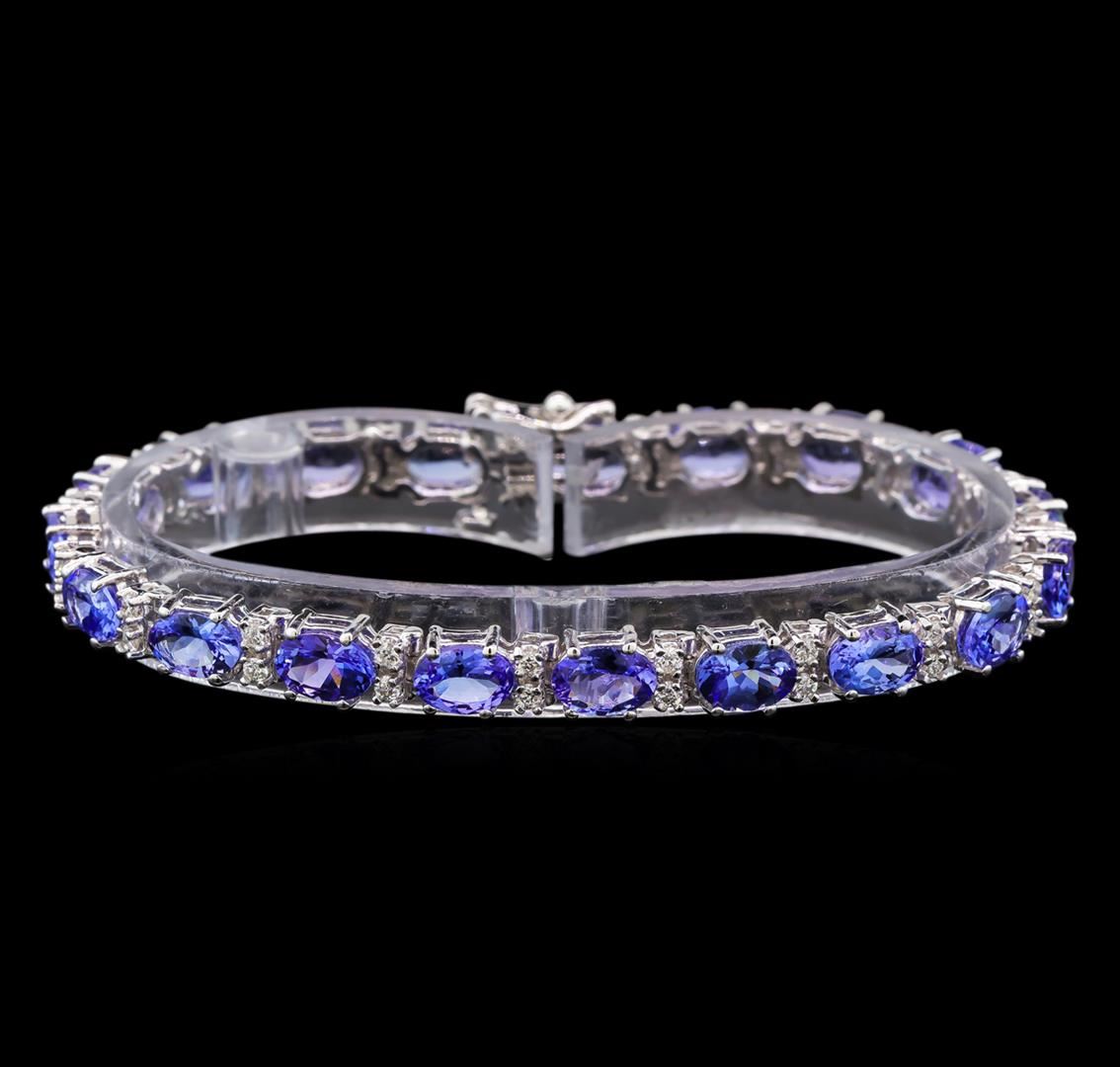 One electronically tested 14KT white gold ladies cast tanzanite and diamond bracelet with a hidden box clasp with safety closer with a bright polish finish. Measurements: 7" in length Identified with markings of "14K". Condition is new. Containing: Nineteen prong set oval modified brilliant cut natural tanzanites, measuring 6.80 x 5.00 x 3.25mm, approximate total weight of 14.82ct., clarity is eye clean, type I, medium light, very slightly grayish, violet color, (GIA V 4/3), cut is good. Thirty-Eight prong set round brilliant cut diamonds, measuring 1.80 - 1.80 x 1.08mm (depth est.) approximate total weight of 38 Stones = 0.81ct. Clarity: SI-1 to SI-2. Color: I - J, Cut is Good. Colored gemstones are presumed to have been subjected to commonly used enhancement processes. All diamonds and colored gemstones are graded in the mounting, unless otherwise stated. Total Weight of Colored Stones 14.82ct. Total Weight of Diamonds 0.81ct. Total Weight of Bracelet 14.50 grams. GGL Appraised at $7,605.00.