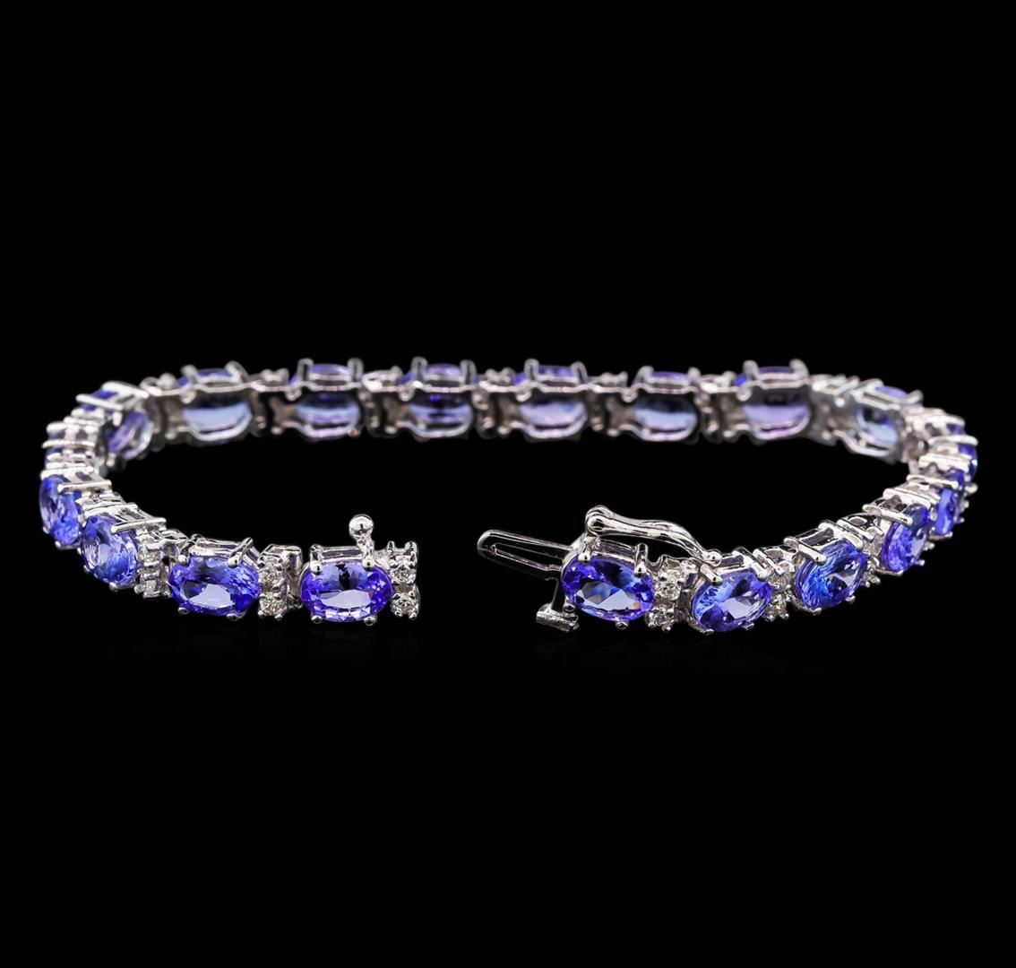 One electronically tested 14KT white gold ladies cast tanzanite and diamond bracelet with a hidden box clasp with safety closer with a bright polish finish. Measurements: 7" in length Identified with markings of "14K". Condition is new. Containing: Nineteen prong set oval modified brilliant cut natural tanzanites, measuring 6.80 x 5.00 x 3.25mm, approximate total weight of 14.82ct., clarity is eye clean, type I, medium light, very slightly grayish, violet color, (GIA V 4/3), cut is good. Thirty-Eight prong set round brilliant cut diamonds, measuring 1.80 - 1.80 x 1.08mm (depth est.) approximate total weight of 38 Stones = 0.81ct. Clarity: SI-1 to SI-2. Color: I - J, Cut is Good. Colored gemstones are presumed to have been subjected to commonly used enhancement processes. All diamonds and colored gemstones are graded in the mounting, unless otherwise stated. Total Weight of Colored Stones 14.82ct. Total Weight of Diamonds 0.81ct. Total Weight of Bracelet 14.50 grams. GGL Appraised at $7,605.00.