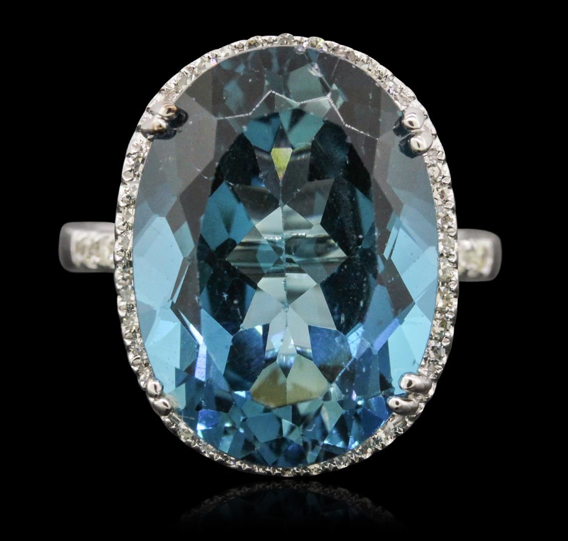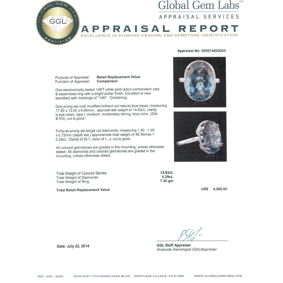 One electronically tested 14KT white gold ladies combination cast & assembled ring with a bright polish finish. Condition is new. Identified with markings of "14K". Containing: One prong set oval modified brilliant cut natural blue topaz, measuring 17.90 x 13.00 x 8.80mm, approximate weight of 14.83ct., clarity is eye clean, type I, medium, moderately strong, blue color, (GIA B 5/4), cut is good. Forty-Six prong set single cut diamonds, measuring 1.40 - 1.00 x 0.72mm (depth est.) approximate total weight of 46 Stones = 0.29ct. Clarity: SI-1. Color: I - J, Cut is Good. All colored gemstones are graded in the mounting, unless otherwise stated. All diamonds and colored gemstones are graded in the mounting, unless otherwise stated. Total Weight of Colored Stones 14.83ct. Total Weight of Diamonds 0.29ct. Total Weight of Ring 7.30 grams. GGL Appraised at $4,280.00.