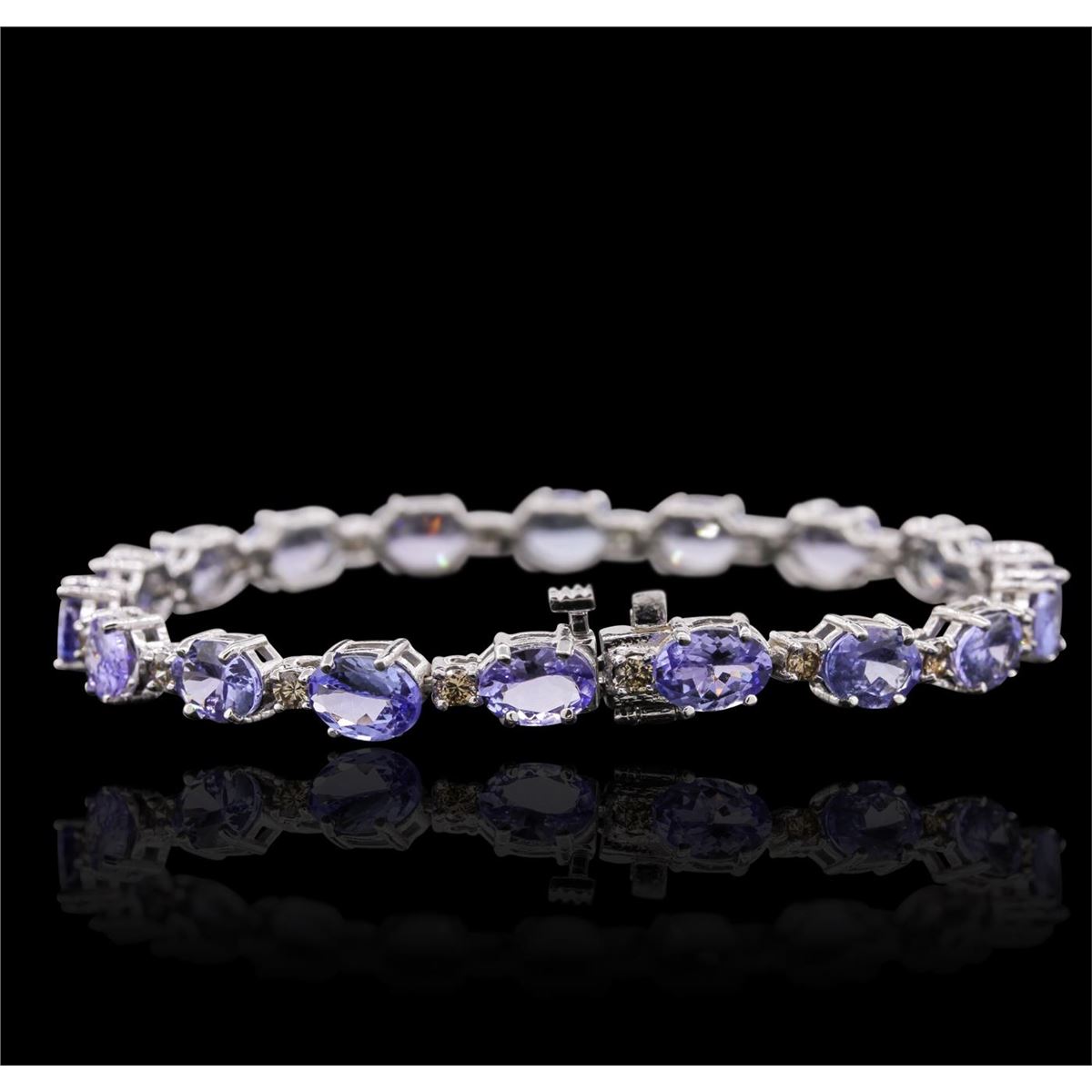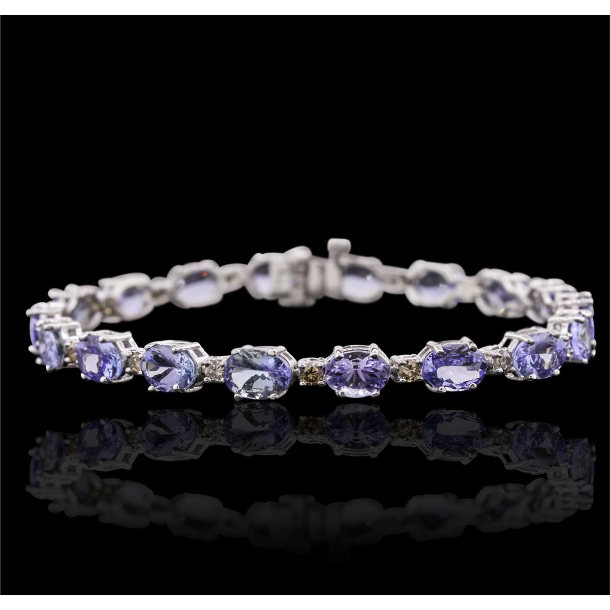 One electronically tested 14KT white gold ladies cast & assembled tanzanite and diamond bracelet with a bright polish finish. Condition is new, good workmanship. Seven inch length bracelet features a flexible ribbon of tanzanite alternated by diamonds terminating in a concealed clasp with safety bar. Identified with markings of "14K". Containing: Eighteen prong set oval mixed cut natural tanzanites, measuring 7.00 x 5.00 x 3.25mm, 6%. bulge factor, approximate. Total Weight of 14.98ct., clarity is eye clean, type I, medium, very slightly grayish, violet color, (GIA V 5/3), cut is good. Transmitting light with a minimum of distortion, transparent. Measurements & the color grade are an average for the group. Graded in the setting. Tanzanite is a very rare gemstone that is only found in the country of Tanzania. Originally discovered in 1967. Tiffany & Company, named the stone Tanzanite. It is found in the Usumburu Mountains that border the Umba Valley of northern Tanzania. Tanzanite occurs in gray, brown, violet, blue, reddish-purple, & green. The gem is interesting because of its exceptional pleochroism. Rotated in different directions a tanzanite will exhibit multiple changes of color. Tanzanite has a low tolerance to ultrasonic cleaning, and should not be cleaned using this method. Eighteen prong set round brilliant cut diamonds, measuring 2.60 - 2.50 x 1.53mm (depth est.) approximate. Total Weight of 18 Stones = 1.19ct. Graded in the setting. Clarity: SI-1 to I-1. Total Weight of Colored Stones 14.98ct. Total Weight of Diamonds 1.19ct. Total Weight of Bracelet 11.20 grams. AIG Appraised at $11,300.00.