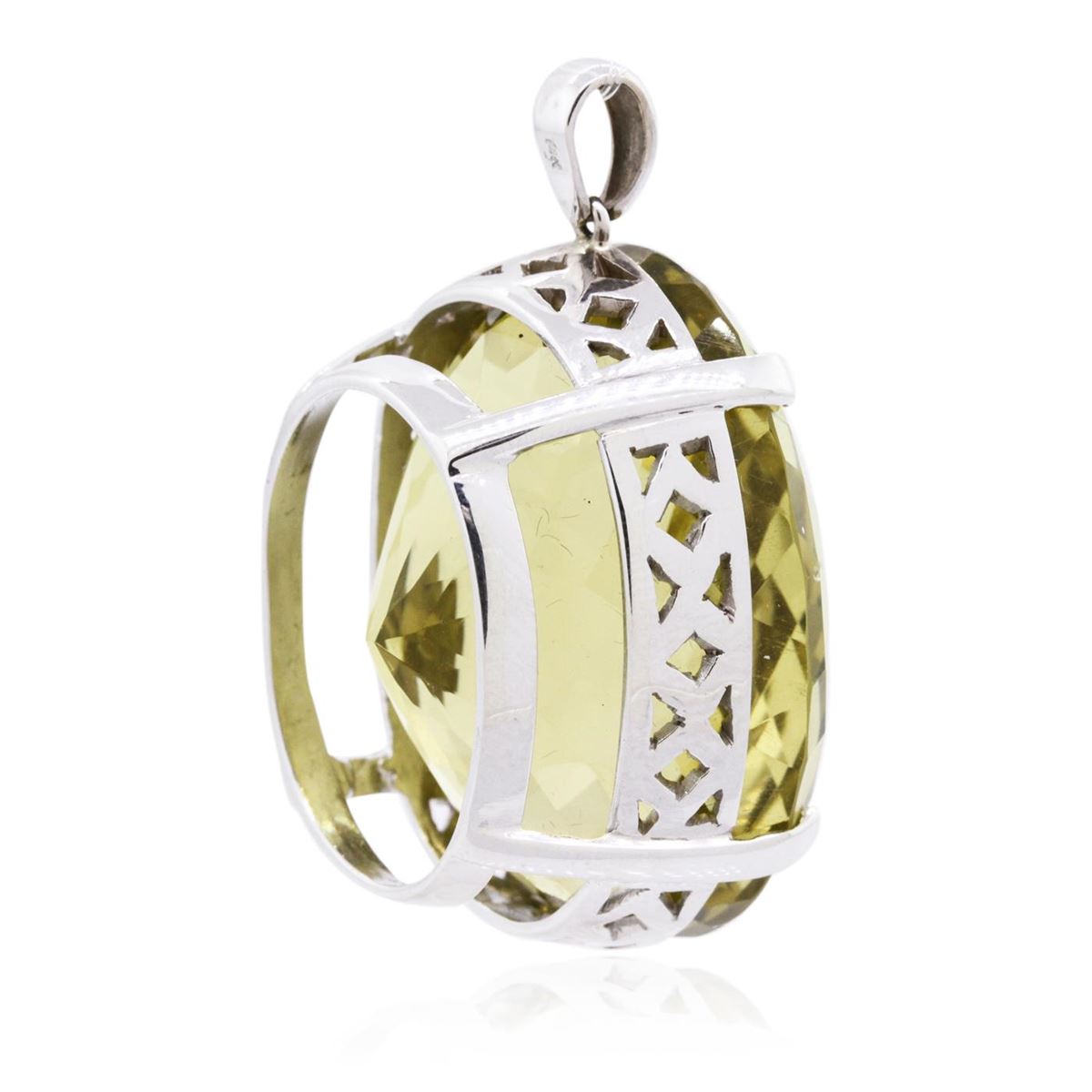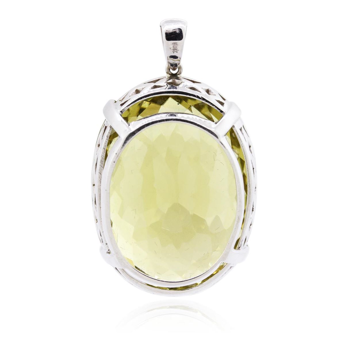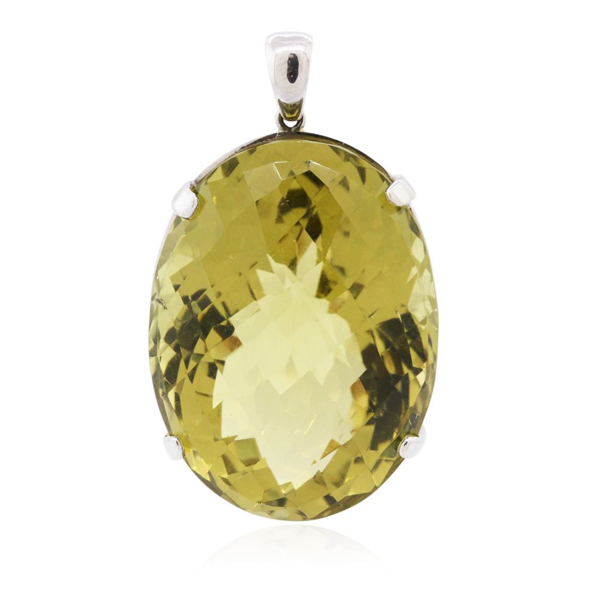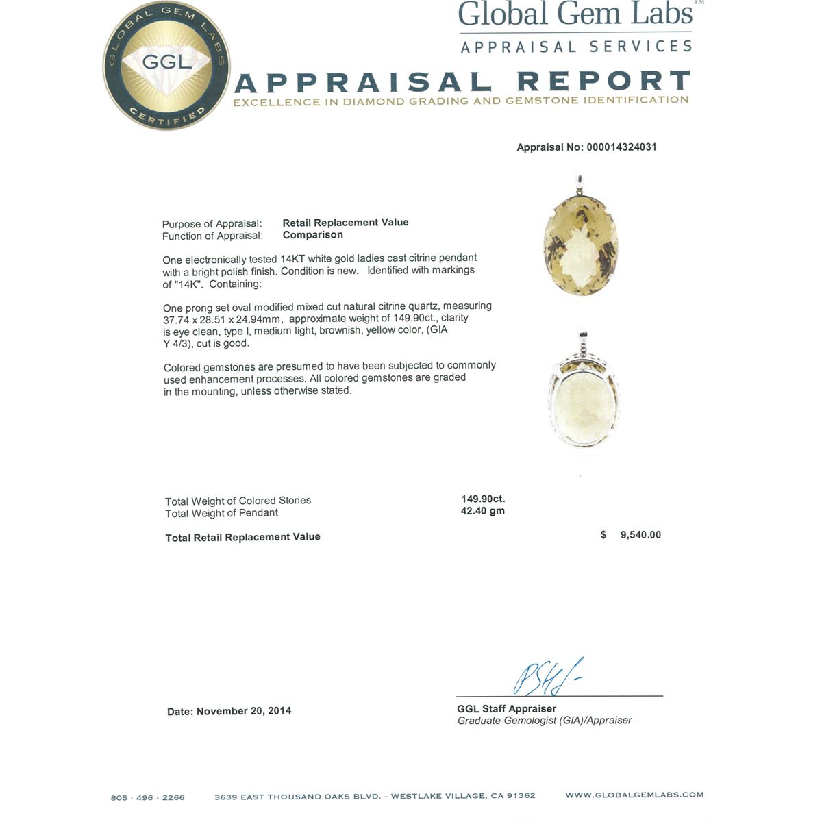 One electronically tested 14KT white gold ladies cast citrine pendant with a bright polish finish. Identified with markings of "14K". Condition is new. Containing: One prong set oval modified mixed cut natural citrine quartz, measuring 37.74 x 28.51 x 24.94mm, approximate weight of 149.90ct., clarity is eye clean, type I, medium light, brownish, yellow color, (GIA Y 4/3), cut is good. Colored gemstones are presumed to have been subjected to commonly used enhancement processes. All colored gemstones are graded in the mounting, unless otherwise stated. Total Weight of Colored Stones 149.90ct. Total Weight of Pendant 42.40 grams. GGL Appraised at $9,540.00.