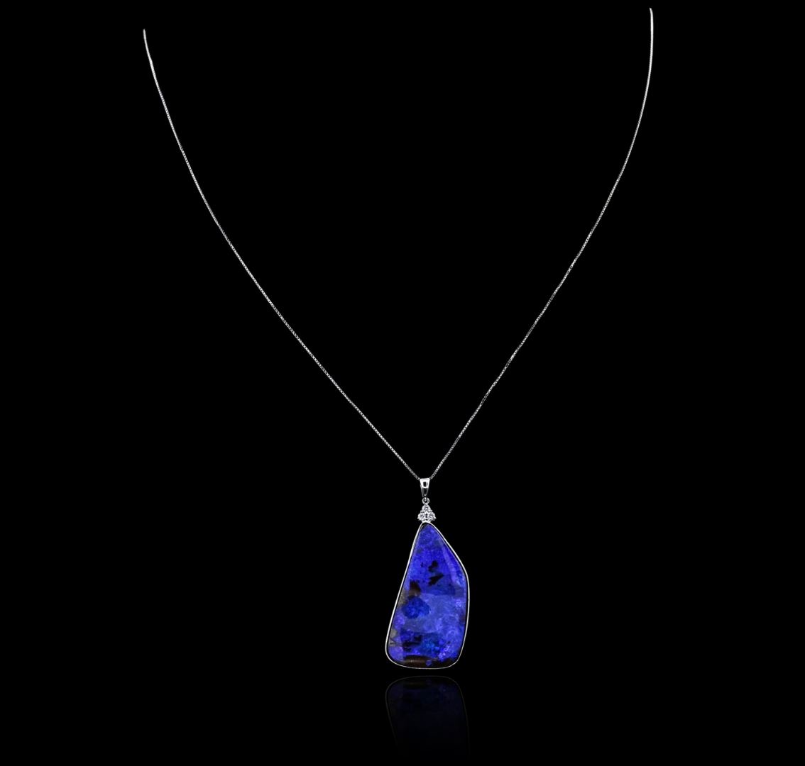 One electronically tested 14KT white gold ladies combination cast & assembled opal and diamond pendant & chain 16.0" long, box link with a spring ring clasp with a bright polish finish. Identified with markings of "14K". Condition is new. Containing: One semi black opal that is cut in a free-form shape and is bezel set, measuring 35.00. mm long x 18.00. mm wide, and 4.30 mm thick and the approximate weight is 15.00. carats. The opal has a somewhat bright, blue only play of color (fire) in a rolling flashfire pattern; a dome; a good cut; slightly included; consistent in its brightness and pattern; and is somewhat directional. Three prong set round brilliant cut diamonds, measuring 1.80 - 1.80 x 1.08mm (depth est.) approximate total weight of 3 Stones = 0.06ct. Clarity: I-1. Color: I - J, Cut is Good. Colored gemstones are presumed to have been subjected to commonly used enhancement processes. All diamonds and colored gemstones are graded in the mounting, unless otherwise stated. Total Weight of Diamonds 0.06ct. Total Weight of Opals 15.00ct. Total Weight of Pendant & Chain 9.70 grams. GGL Appraised at $2,835.00.
