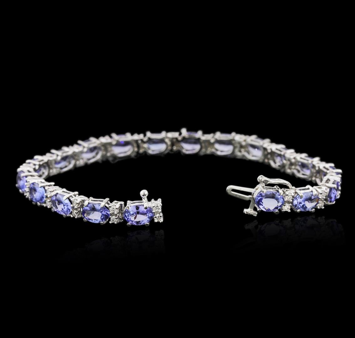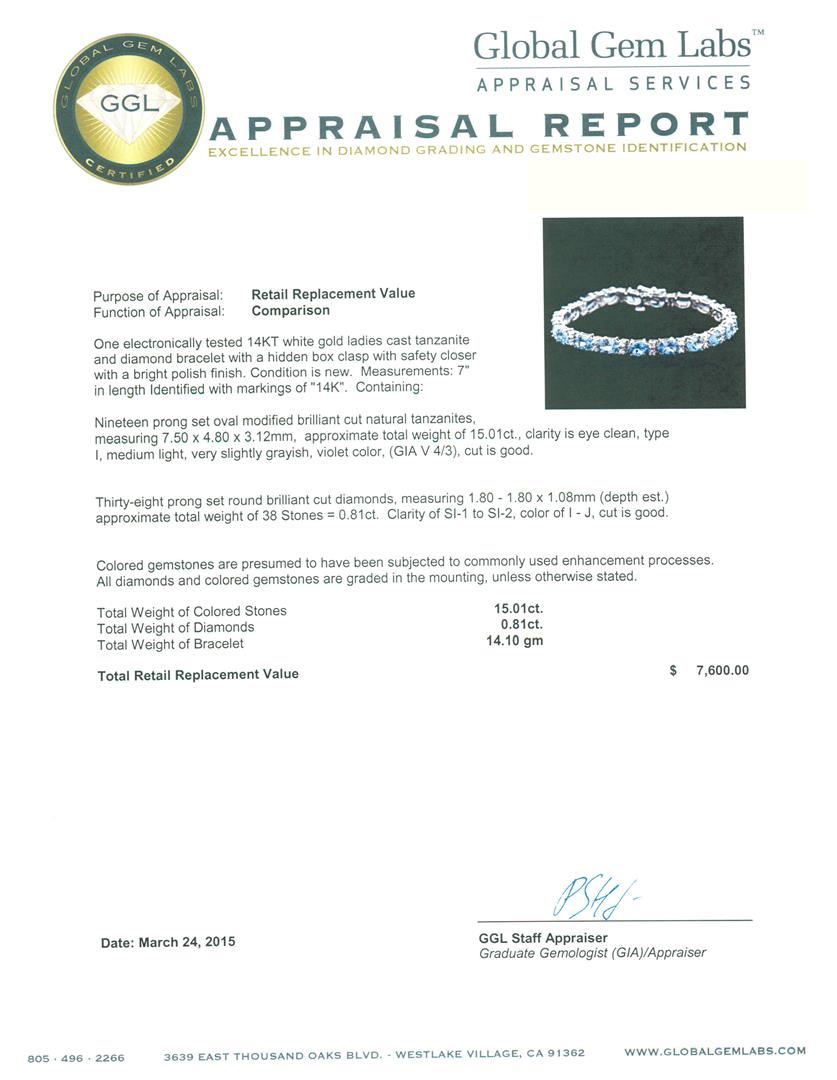 One electronically tested 14KT white gold ladies cast tanzanite and diamond bracelet with a hidden box clasp with safety closer with a bright polish finish. Measurements: 7" in length Identified with markings of "14K". Condition is new. Containing: Nineteen prong set oval modified brilliant cut natural tanzanites, measuring 7.50 x 4.80 x 3.12mm, approximate total weight of 15.01ct., clarity is eye clean, type I, medium light, very slightly grayish, violet color, (GIA V 4/3), cut is good. Thirty-Eight prong set round brilliant cut diamonds, measuring 1.80 - 1.80 x 1.08mm (depth est.) approximate total weight of 38 Stones = 0.81ct. Clarity: SI-1 to SI-2. Color: I - J, Cut is Good. Colored gemstones are presumed to have been subjected to commonly used enhancement processes. All diamonds and colored gemstones are graded in the mounting, unless otherwise stated. Total Weight of Colored Stones 15.01ct. Total Weight of Diamonds 0.81ct. Total Weight of Bracelet 14.10 grams. GGL Appraised at $7,600.00.