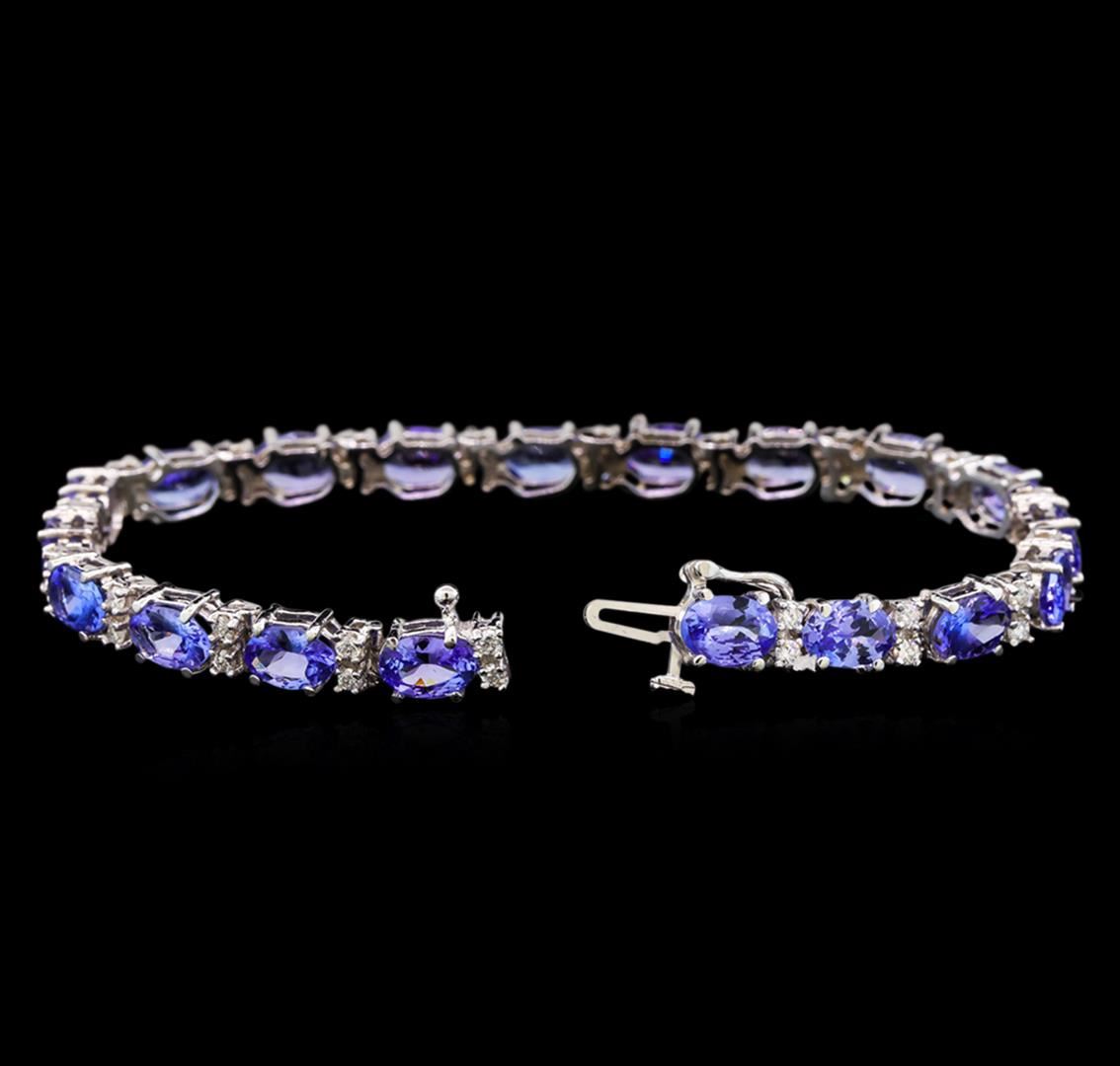 One electronically tested 14KT white gold ladies cast tanzanite and diamond bracelet with a hidden box clasp with safety closer with a bright polish finish. Measurements: 7" in length Identified with markings of "14K". Condition is new. Containing: Nineteen prong set oval modified brilliant cut natural tanzanites, measuring 7.50 x 4.80 x 3.12mm, approximate total weight of 15.01ct., clarity is eye clean, type I, medium light, very slightly grayish, violet color, (GIA V 4/3), cut is good. Thirty-Eight prong set round brilliant cut diamonds, measuring 1.80 - 1.80 x 1.08mm (depth est.) approximate total weight of 38 Stones = 0.81ct. Clarity: SI-1 to SI-2. Color: I - J, Cut is Good. Colored gemstones are presumed to have been subjected to commonly used enhancement processes. All diamonds and colored gemstones are graded in the mounting, unless otherwise stated. Total Weight of Colored Stones 15.01ct. Total Weight of Diamonds 0.81ct. Total Weight of Bracelet 14.10 grams. GGL Appraised at $7,600.00.