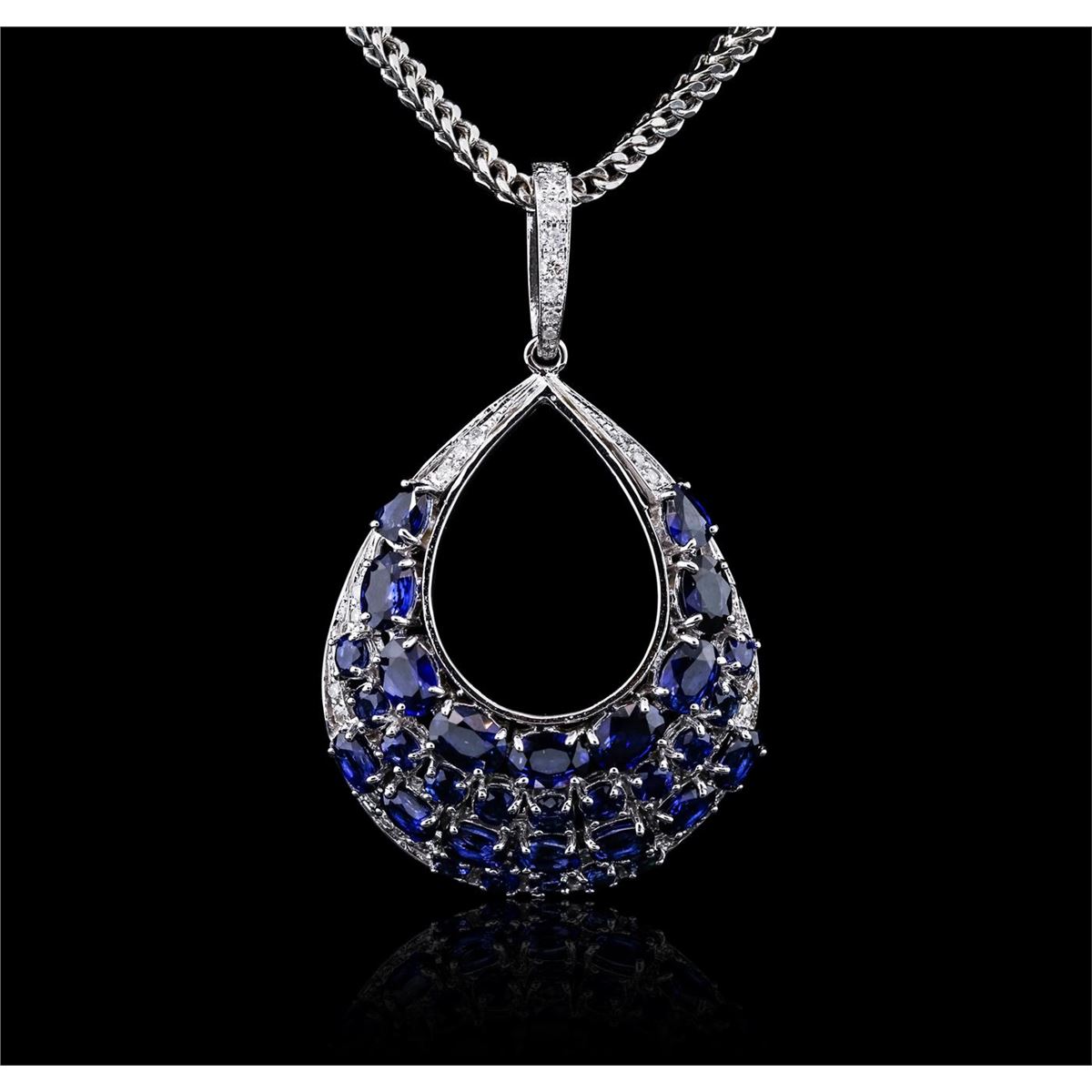 One electronically tested 14KT white gold ladies cast & assembled blue sapphire and diamond pendant with chain. Condition is new, good workmanship. The pendant features sapphires set within a stylized tear drop design with diamond accents, completed by a diamond set bail. The pendant is supported by an eighteen inch length 14KT white gold designer style chain, terminating in a lobster claw clasp. Bright polish finish with migraine detailing. Identified with markings of "K14". Containing: Thirty-two prong set round and oval mixed cut natural blue sapphires approximate total weight of 15.07ct., clarity is slightly included, type II, medium dark, very slightly grayish, blue color, (GIA B 6/3), cut is good. Transmitting light with a minimum of distortion, transparent. Naturally occurring internal & external characteristics are present. Indications of laboratory high temperature diffusion treatment. Color grade is an average for the group. Graded in the setting. Twenty-nine bead set round brilliant cut diamonds, measuring 2.30 - 1.80 x 1.23mm (depth est.) approximate total weight of 29 Stones = 0.79ct. Graded in the setting. Clarity VS-2 to SI-1. Color G - H. Total Weight of Colored Stones 15.07ct. Total Weight of Diamonds 0.79ct. Total Weight of Pendant With Chain 26.87gm. AIG Appraised at $11,000.00.