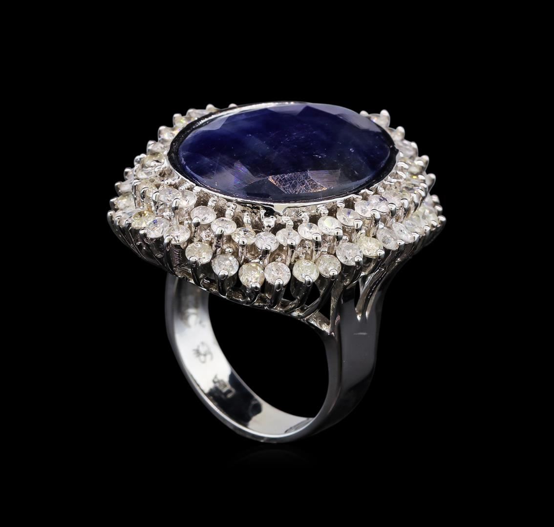 One electronically tested 14KT white gold ladies cast sapphire and diamond ring with a bright polish finish. Identified with markings of "14K". Condition is very good. Containing: One bezel set oval modified mixed cut natural blue sapphire, measuring 22.50 x 15.00 x 5.32mm, approximate weight of 15.08ct., clarity is severely included, type II, dark, moderately strong, blue color, (GIA B 7/4)Ninety prong set round brilliant cut diamonds, measuring 2.00 - 2.00 x 1.20mm (depth est.) approximate total weight of 90 Stones = 2.63ct. Clarity: I-1 to I-3. Color: I - J. Colored gemstones are presumed to have been subjected to commonly used enhancement processes. All diamonds and colored gemstones are graded in the mounting, unless otherwise stated. Total Weight of Colored Stones 15.08ct. Total Weight of Diamonds 2.63ct. Total Weight of Ring 16.80 grams. GGL Appraised at $5,280.00.