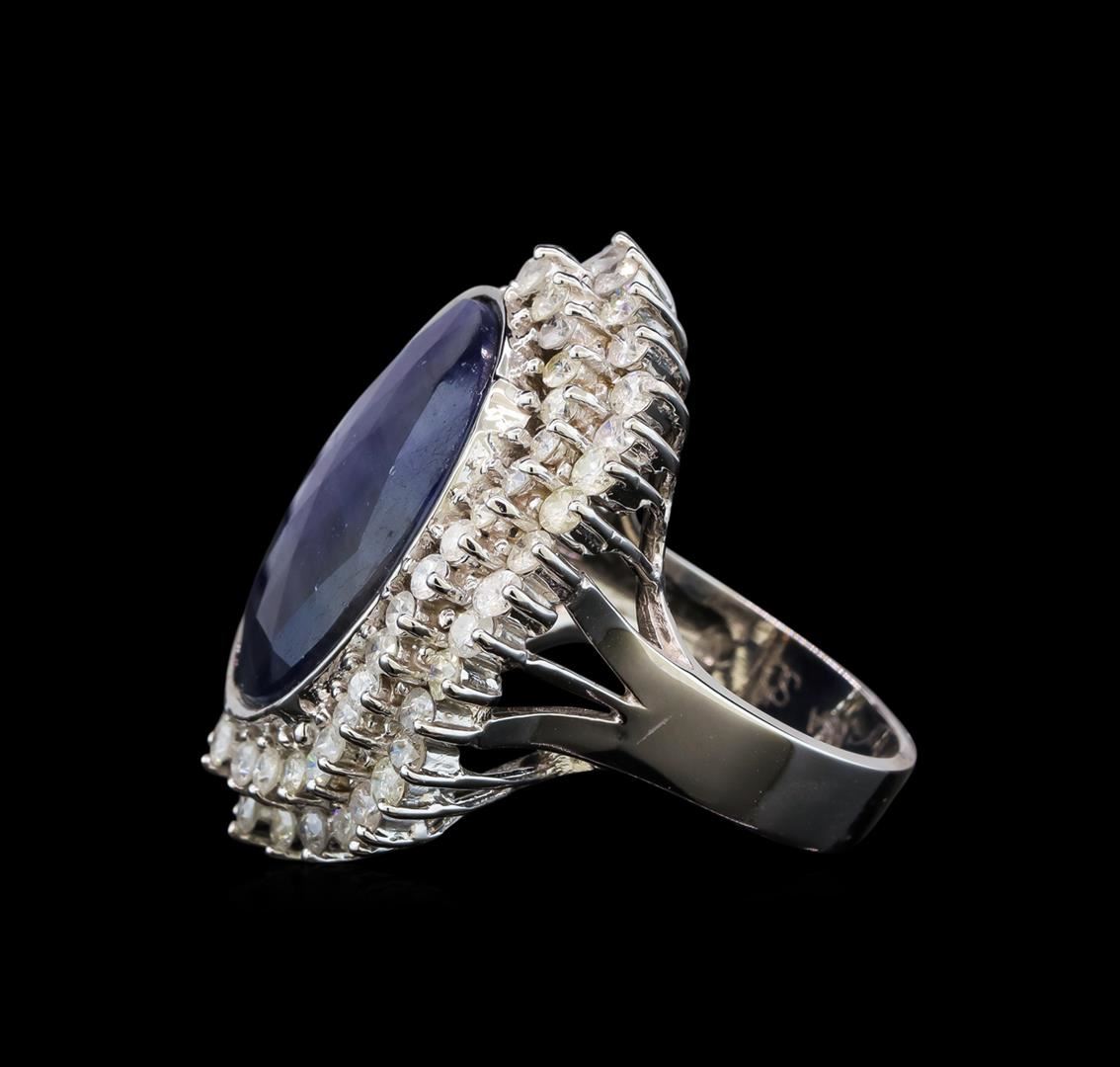 One electronically tested 14KT white gold ladies cast sapphire and diamond ring with a bright polish finish. Identified with markings of "14K". Condition is very good. Containing: One bezel set oval modified mixed cut natural blue sapphire, measuring 22.50 x 15.00 x 5.32mm, approximate weight of 15.08ct., clarity is severely included, type II, dark, moderately strong, blue color, (GIA B 7/4)Ninety prong set round brilliant cut diamonds, measuring 2.00 - 2.00 x 1.20mm (depth est.) approximate total weight of 90 Stones = 2.63ct. Clarity: I-1 to I-3. Color: I - J. Colored gemstones are presumed to have been subjected to commonly used enhancement processes. All diamonds and colored gemstones are graded in the mounting, unless otherwise stated. Total Weight of Colored Stones 15.08ct. Total Weight of Diamonds 2.63ct. Total Weight of Ring 16.80 grams. GGL Appraised at $5,280.00.