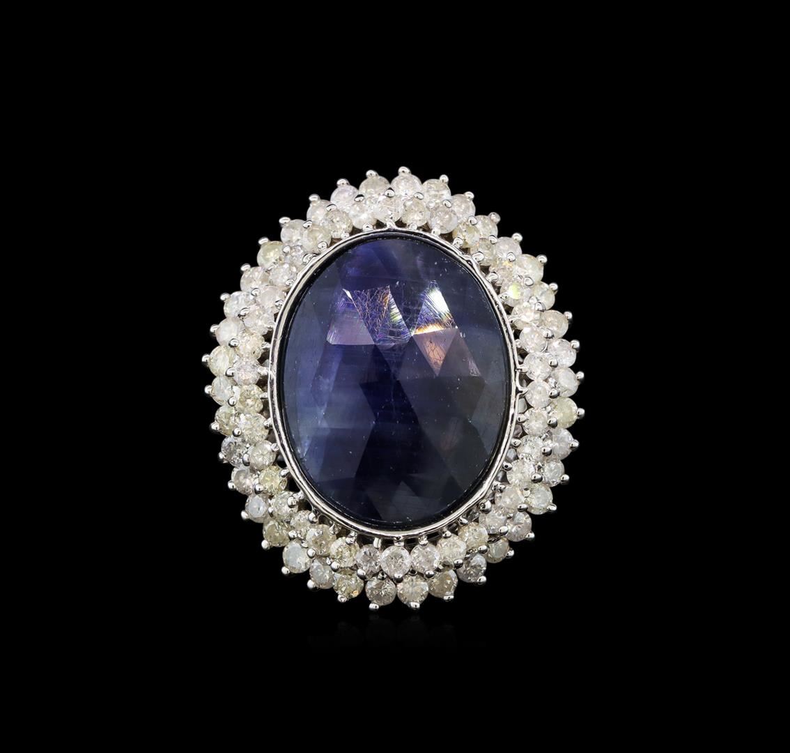 One electronically tested 14KT white gold ladies cast sapphire and diamond ring with a bright polish finish. Identified with markings of "14K". Condition is very good. Containing: One bezel set oval modified mixed cut natural blue sapphire, measuring 22.50 x 15.00 x 5.32mm, approximate weight of 15.08ct., clarity is severely included, type II, dark, moderately strong, blue color, (GIA B 7/4)Ninety prong set round brilliant cut diamonds, measuring 2.00 - 2.00 x 1.20mm (depth est.) approximate total weight of 90 Stones = 2.63ct. Clarity: I-1 to I-3. Color: I - J. Colored gemstones are presumed to have been subjected to commonly used enhancement processes. All diamonds and colored gemstones are graded in the mounting, unless otherwise stated. Total Weight of Colored Stones 15.08ct. Total Weight of Diamonds 2.63ct. Total Weight of Ring 16.80 grams. GGL Appraised at $5,280.00.
