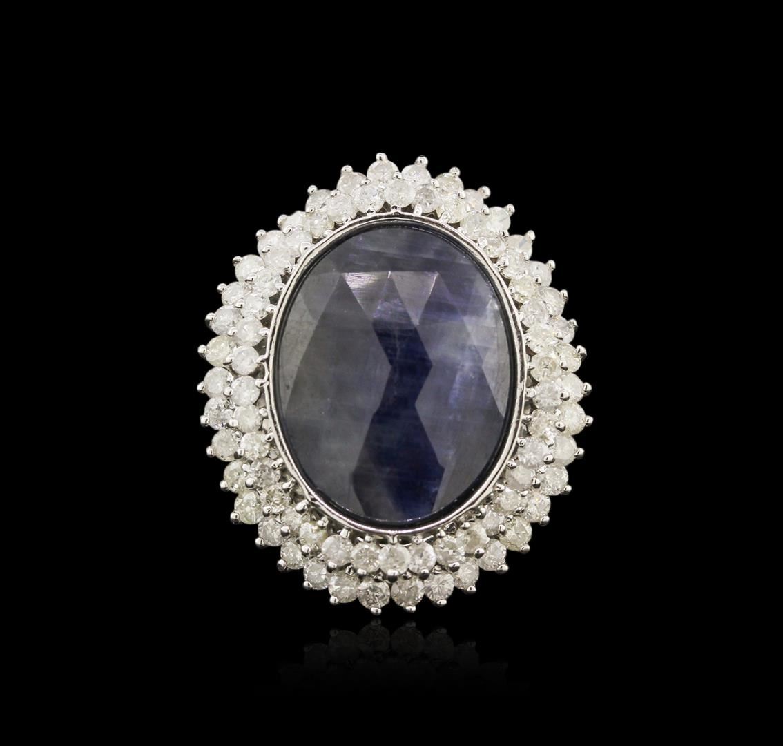 One electronically tested 14KT white gold ladies cast sapphire and diamond ring with a bright polish finish. Identified with markings of "14K". Condition is very good. Containing: One bezel set oval modified mixed cut natural blue sapphire, measuring 22.50 x 15.00 x 5.32mm, approximate weight of 15.08ct., clarity is severely included, type II, dark, moderately strong, blue color, (GIA B 7/4)Ninety prong set round brilliant cut diamonds, measuring 2.00 - 2.00 x 1.20mm (depth est.) approximate total weight of 90 Stones = 2.63ct. Clarity: I-1 to I-3. Color: I - J. Colored gemstones are presumed to have been subjected to commonly used enhancement processes. All diamonds and colored gemstones are graded in the mounting, unless otherwise stated. Total Weight of Colored Stones 15.08ct. Total Weight of Diamonds 2.63ct. Total Weight of Ring 16.80 grams. GGL Appraised at $5,280.00.