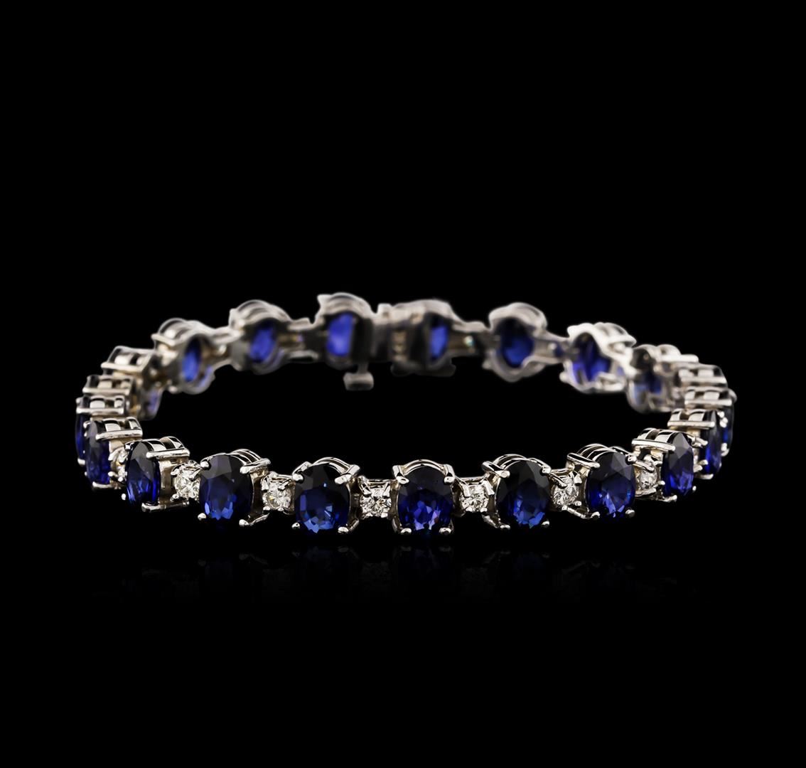 One electronically tested 14KT white gold ladies cast sapphire and diamond bracelet with a hidden box clasp with safety closer with a bright polish finish. Measurements: 7" in length Identified with markings of "14K". Condition is new. Containing: Twenty-one prong set oval modified brilliant cut natural blue sapphires, measuring 6.90 x 5.00 x 2.50mm, approximate total weight of 15.12ct., clarity is moderately included, type II, medium, moderately strong, blue color, (GIA B 5/4), cut is good. Twenty-One prong set round brilliant cut diamonds, measuring 2.80 - 2.80 x 1.68mm (depth est.) approximate total weight of 21 Stones = 1.69ct. Clarity of SI-1 to SI-2, Color of I - J, Cut is Good. Colored gemstones are presumed to have been subjected to commonly used enhancement processes. All diamonds and colored gemstones are graded in the mounting, unless otherwise stated. Total Weight of Colored Stones 15.12ct. Total Weight of Diamonds 1.69ct. Total Weight of Bracelet 19.20 grams. GGL Appraised at $9,345.00.
