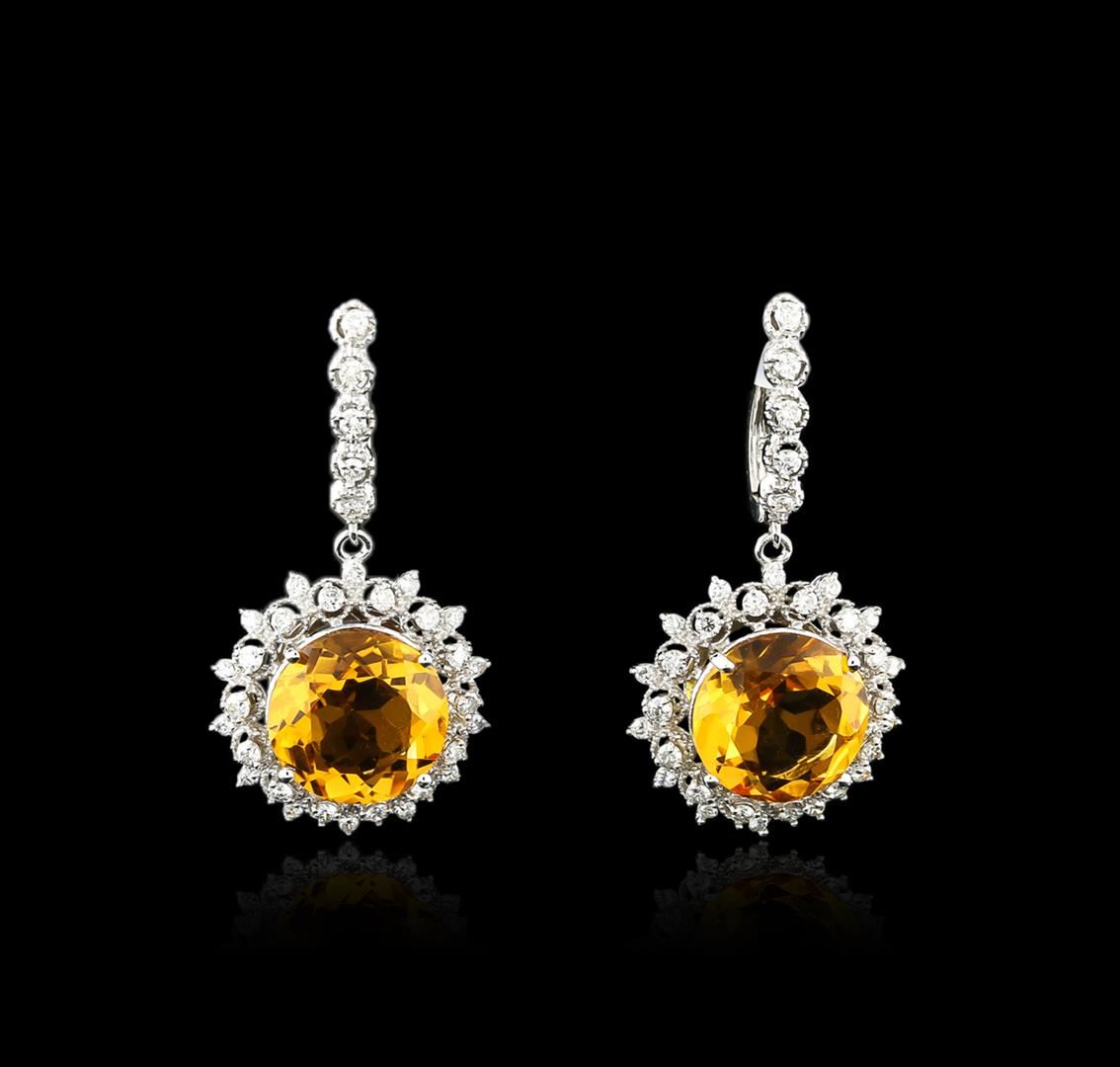 One pair electronically tested 14KT white gold ladies cast citrine and diamond earrings with hinged clip backs with a bright polish finish. Identified with markings of "14K". Condition is new. Containing: Two prong set oval round modified brilliant cut natural citrine quartzes, measuring 13.00 - 13.00 x 8.45 mm, approximate total weight of 15.20ct., clarity is eye clean, type I, medium light, brownish, orangy yellow color, (GIA oY 4/3), cut is good. Sixty-Six prong set round brilliant cut diamonds, measuring 1.70 - 1.50 x 0.96mm (depth est.) approximate total weight of 66 Stones = 0.98ct. Clarity: SI-1 to I-1. Color: H - I, Cut is Good. Diamonds and colored gemstones are graded in the mounting, unless otherwise stated. Colored gemstones are presumed to have been subjected to commonly used enhancement processes. Total Weight of Colored Stones 15.20ct. Total Weight of Diamonds 0.98ct. Total Weight of Earrings 11.90 grams. GGL Appraised at $3,550.00.