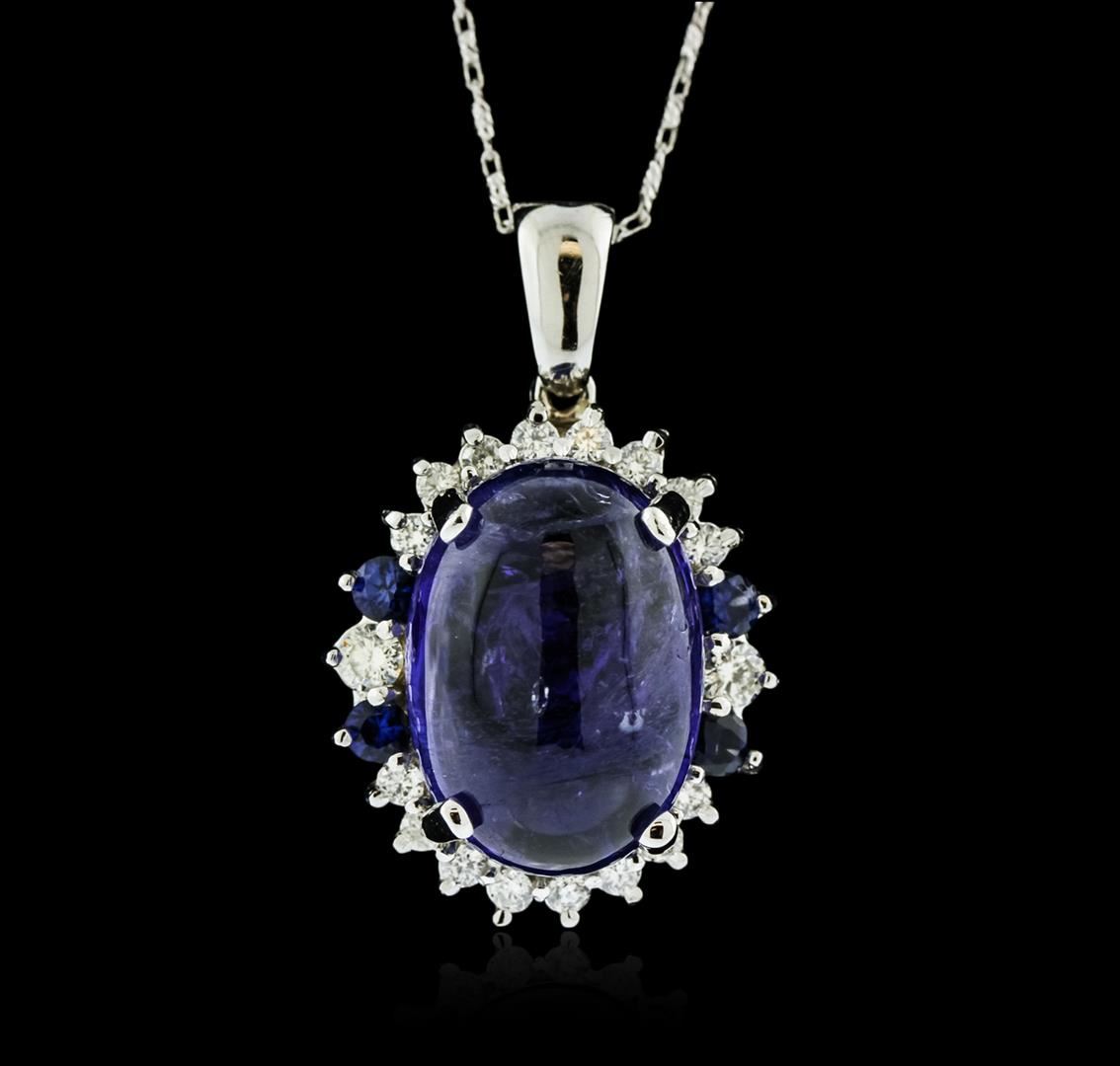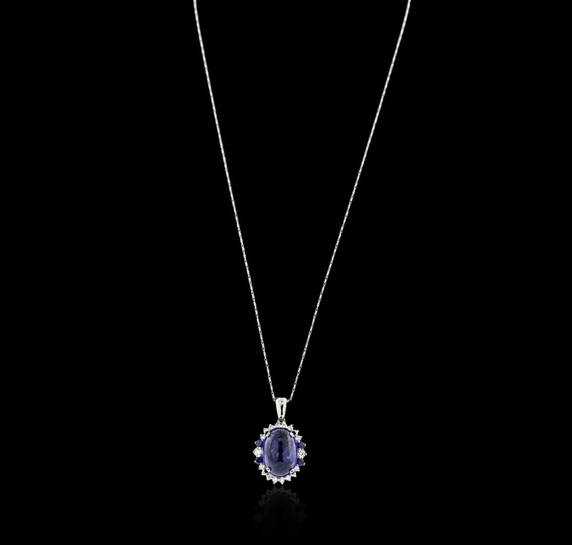 One electronically tested 14KT white gold ladies cast tanzanite, sapphire and diamond pendant & chain 18.0" long, with a lobster claw clasp with a bright polish finish. Identified with markings of "585". Condition is new. Containing: One prong set oval cabochon cut natural tanzanite, measuring 17.28 x 12.23 x 7.95mm, approximate weight of 15.20ct., clarity is heavily included, type I, medium light, very slightly grayish, violet color, (GIA V 4/3), cut is good. Four prong set round modified brilliant cut natural blue sapphires, measuring 2.60 - 2.60 x 1.69 mm, approximate total weight of 0.36ct., clarity is slightly included, type II, medium, moderately strong, blue color, (GIA B 5/4), cut is good. Two prong set round brilliant cut diamonds, measuring 3.00 - 3.00 x 1.80mm (depth est.) approximate total weight of 2 Stones = 0.20ct. Clarity: SI-1 to SI-2. Color: J - K, Cut is Good. Sixteen prong set round brilliant cut diamonds, measuring 1.90 - 1.90 x 1.14mm (depth est.) approximate total weight of 16 Stones = 0.40ct. Clarity: SI-1 to SI-2. Color: J - K, Cut is Good. Colored gemstones are presumed to have been subjected to commonly used enhancement processes. All diamonds and colored gemstones are graded in the mounting, unless otherwise stated. Total Weight of Colored Stones 15.56ct. Total Weight of Diamonds 0.60ct. Total Weight of Pendant & Chain 10.10 grams. GGL Appraised at $6,575.00.