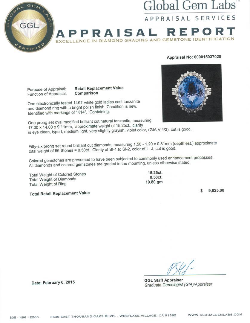 One electronically tested 14KT white gold ladies cast tanzanite and diamond ring with a bright polish finish. Identified with markings of "K14". Condition is new. Containing: One prong set oval modified brilliant cut natural tanzanite, measuring 17.00 x 14.00 x 9.11mm, approximate weight of 15.25ct., clarity is eye clean, type I, medium light, very slightly grayish, violet color, (GIA V 4/3), cut is good. Fifty-Six prong set round brilliant cut diamonds, measuring 1.50 - 1.20 x 0.81mm (depth est.) approximate total weight of 56 Stones = 0.50ct. Clarity: SI-1 to SI-2. Color: I - J, Cut is Good. Colored gemstones are presumed to have been subjected to commonly used enhancement processes. All diamonds and colored gemstones are graded in the mounting, unless otherwise stated. Total Weight of Colored Stones 15.25ct. Total Weight of Diamonds 0.50ct. Total Weight of Ring 10.80 grams. GGL Appraised at $9,625.00.