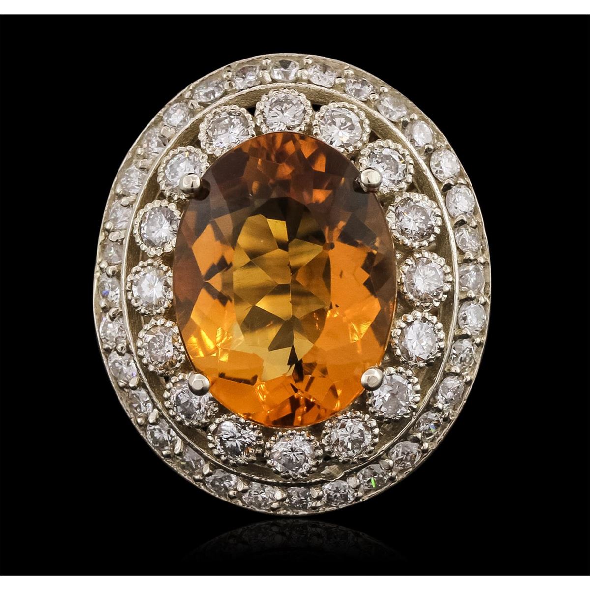 One electronically tested 14KT white gold ladies combination cast & assembled engagement ring with a bright polish finish. Identified with markings of "14K". Condition is new. Containing: One prong set oval modified brilliant cut natural citrine quartz, measuring 26.00 x 12.20 x 7.93mm, approximate weight of 15.39ct., clarity is eye clean, type I, medium light, brownish, orangy yellow color, (GIA oY 4/3), cut is good. Fifty prong set round brilliant cut diamonds, measuring 2.50 - 1.90 x 1.32mm (depth est.) approximate total weight of 50 Stones = 1.95ct. Clarity: SI-2 to I-1. Color: I - J, Cut is Good. Colored gemstones are presumed to have been subjected to commonly used enhancement processes. All diamonds and colored gemstones are graded in the mounting, unless otherwise stated. Total Weight of Colored Stones 15.39ct. Total Weight of Diamonds 1.95ct. Total Weight of Ring 12.00 grams. GGL Appraised at $7,970.00.