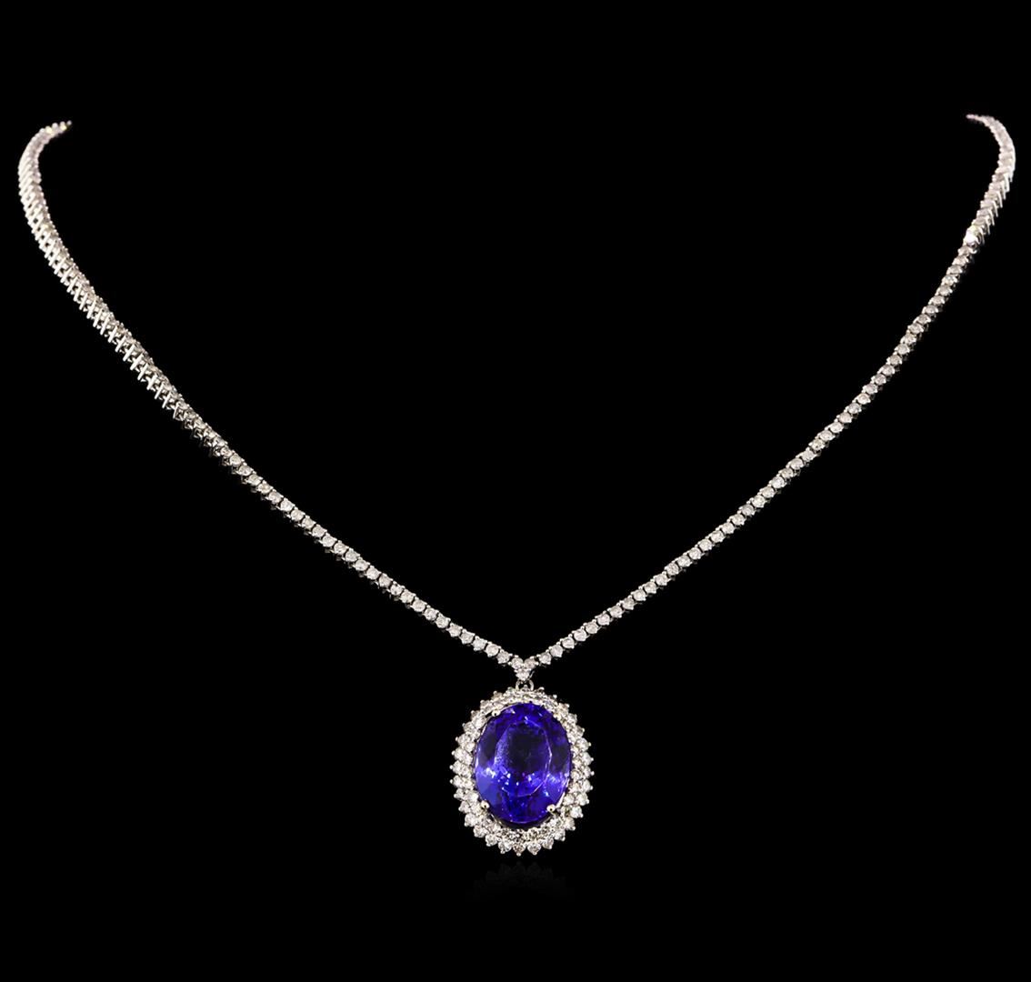 One electronically tested 14KT white gold Ladies combination cast & assembled necklace with a hidden box clasp with a bright polish finish. Condition is new. Measurements: 16" in length. Identified with markings of "14K". Containing: Two Hundred Eighty prong set round brilliant cut diamonds, measuring 1.50 - 1.50 x 0.90mm (depth est.) approximate. Total Weight of 280 Stones = 6.23ct. Clarity: I-1 to I-3. Color: G - H, Cut is Good. One prong set oval modified brilliant cut natural tanzanite, measuring 16.64 x 13.05 x 9.41mm, approximate weight of 15.40ct., clarity is eye clean, type I, medium, moderately strong, bluish violet color, (GIA bV 5/4), cut is excellent. GIA Report: 2151961736.Total Weight of Colored Stones 15.40ct. Total Weight of Diamonds 6.23ct. Total Weight of Necklace 23.10 grams. GGL Appraised at $39,785.00.