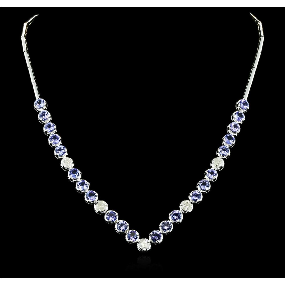 One electronically tested 14KT white gold ladies combination cast & assembled tanzanite and diamond necklace with a hidden box clasp with safety closer with a bright polish finish. Identified with markings of "14K". Condition is new. Containing: Twenty-two prong set round modified brilliant cut natural tanzanites, measuring 5.54 - 5.42 x 3.38 mm, approximate total weight of 15.40ct., clarity is eye clean, type I, medium light, very slightly grayish, violet color, (GIA V 4/3), cut is good. Five prong set round brilliant cut diamonds, measuring 5.59 - 5.33 x 3.28mm (depth est.) approximate total weight of 5 Stones = 2.98ct. Clarity: I-2 to I-3. Color: I - J, Cut is Good. All diamonds and colored gemstones are graded in the mounting, unless otherwise stated. Colored gemstones are presumed to have been subjected to commonly used enhancement processes. Total Weight of Colored Stones 15.40ct. Total Weight of Diamonds 2.98ct. Total Weight of Necklace 34.00 grams. GGL Appraised at $15,925.00.