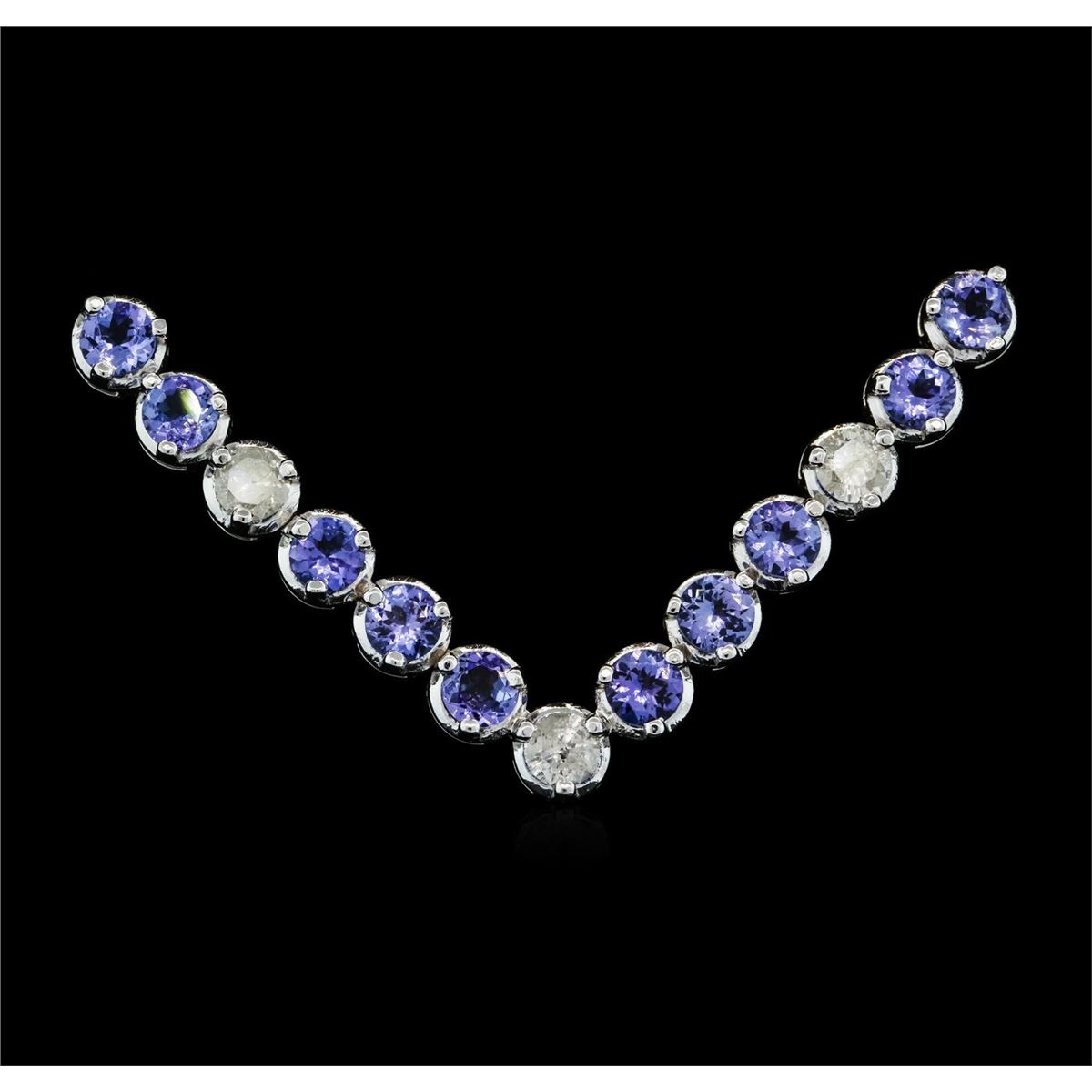 One electronically tested 14KT white gold ladies combination cast & assembled tanzanite and diamond necklace with a hidden box clasp with safety closer with a bright polish finish. Identified with markings of "14K". Condition is new. Containing: Twenty-two prong set round modified brilliant cut natural tanzanites, measuring 5.54 - 5.42 x 3.38 mm, approximate total weight of 15.40ct., clarity is eye clean, type I, medium light, very slightly grayish, violet color, (GIA V 4/3), cut is good. Five prong set round brilliant cut diamonds, measuring 5.59 - 5.33 x 3.28mm (depth est.) approximate total weight of 5 Stones = 2.98ct. Clarity: I-2 to I-3. Color: I - J, Cut is Good. All diamonds and colored gemstones are graded in the mounting, unless otherwise stated. Colored gemstones are presumed to have been subjected to commonly used enhancement processes. Total Weight of Colored Stones 15.40ct. Total Weight of Diamonds 2.98ct. Total Weight of Necklace 34.00 grams. GGL Appraised at $15,925.00.