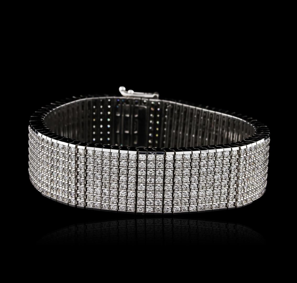 One electronically tested 14KT white gold ladies cast & assembled diamond bracelet with a bright polish finish. Seven inch wearable length bracelet features a five-eighths inch wide flexible diamond ribbon, terminating in a concealed claps with twin safeties. Identified with markings of "14K". Condition is good. Containing: Six Hundred Sixty-Four prong set round brilliant cut diamonds, measuring 1.90 - 1.80 x 1.11mm (depth est.) approximate total weight of 664 Stones = 15.43ct. Graded in the setting. Clarity: VS-1 to VS-2. Color: F - H. Total Weight of Diamonds 15.43ct. Total Weight of Bracelet 79.86 grams. AIG Appraised at $73,295.00.