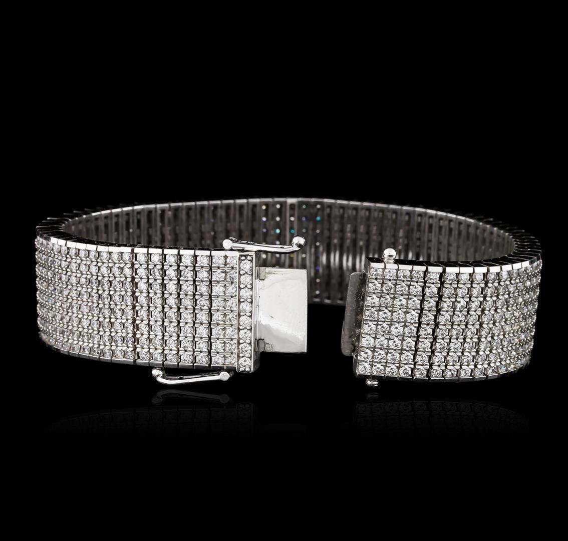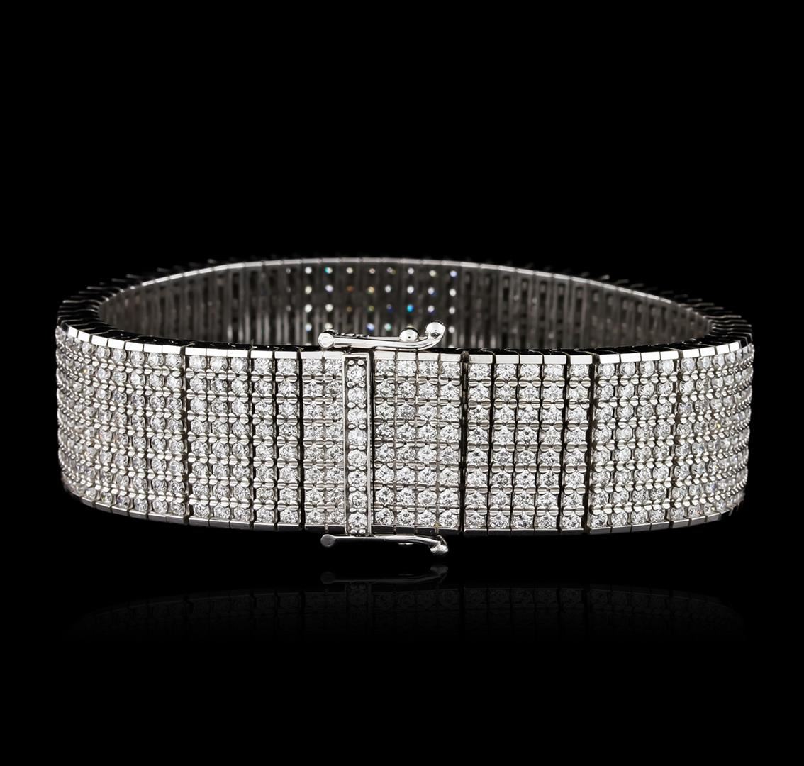 One electronically tested 14KT white gold ladies cast & assembled diamond bracelet with a bright polish finish. Seven inch wearable length bracelet features a five-eighths inch wide flexible diamond ribbon, terminating in a concealed claps with twin safeties. Identified with markings of "14K". Condition is good. Containing: Six Hundred Sixty-Four prong set round brilliant cut diamonds, measuring 1.90 - 1.80 x 1.11mm (depth est.) approximate total weight of 664 Stones = 15.43ct. Graded in the setting. Clarity: VS-1 to VS-2. Color: F - H. Total Weight of Diamonds 15.43ct. Total Weight of Bracelet 79.86 grams. AIG Appraised at $73,295.00.