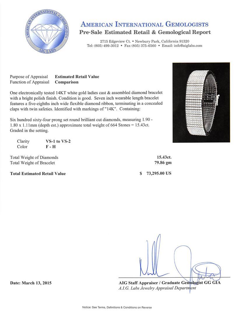 One electronically tested 14KT white gold ladies cast & assembled diamond bracelet with a bright polish finish. Seven inch wearable length bracelet features a five-eighths inch wide flexible diamond ribbon, terminating in a concealed claps with twin safeties. Identified with markings of "14K". Condition is good. Containing: Six Hundred Sixty-Four prong set round brilliant cut diamonds, measuring 1.90 - 1.80 x 1.11mm (depth est.) approximate total weight of 664 Stones = 15.43ct. Graded in the setting. Clarity: VS-1 to VS-2. Color: F - H. Total Weight of Diamonds 15.43ct. Total Weight of Bracelet 79.86 grams. AIG Appraised at $73,295.00.