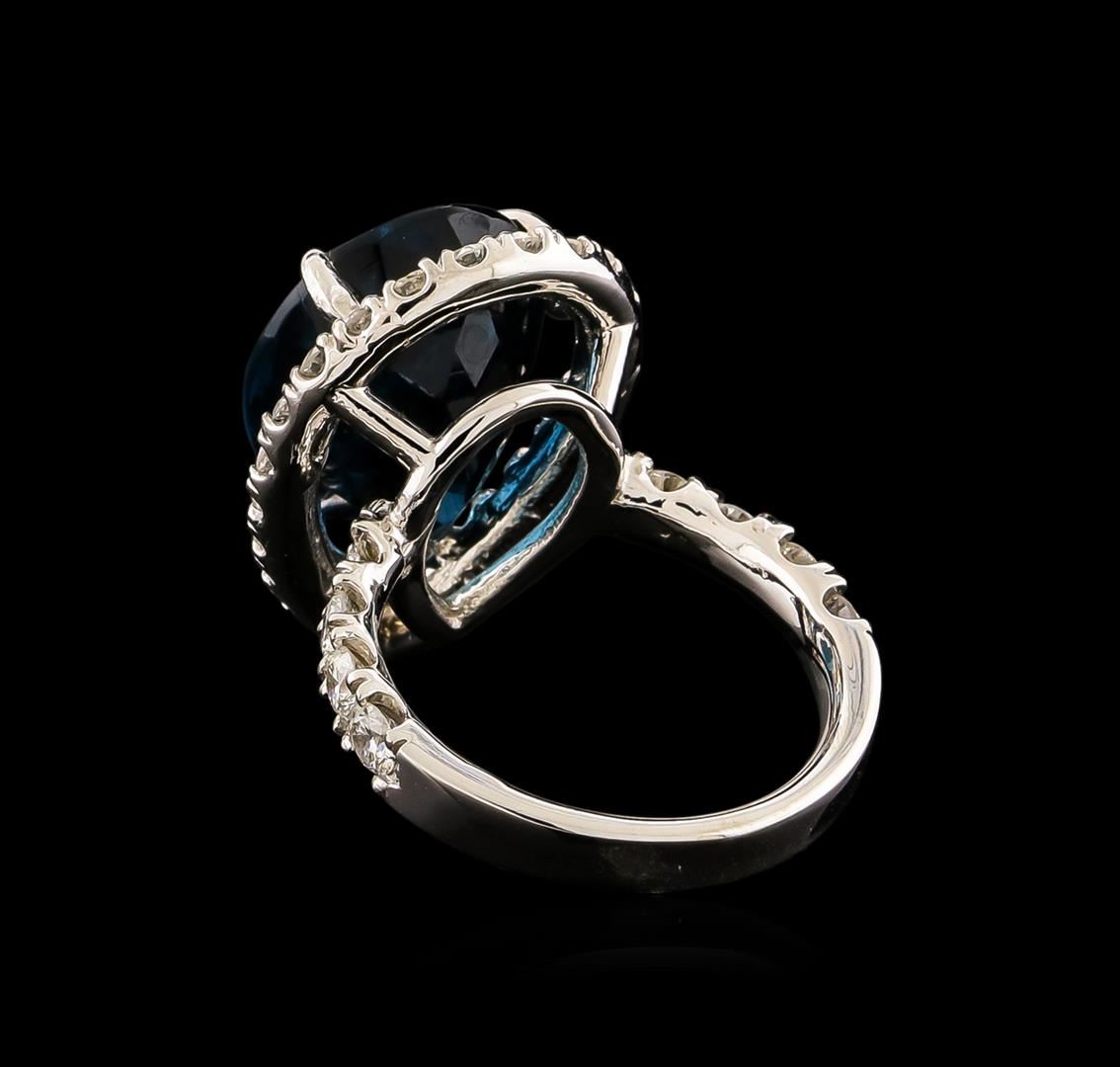 One electronically tested 14KT white gold ladies combination cast & assembled ring with a bright polish finish. Condition is new. Identified with markings of "14K". Containing: One prong set pear modified brilliant cut natural blue topaz, measuring 18.00 x 13.52 x 9.00mm, approximate weight of 15.46ct., clarity is eye clean, type I, medium dark, very slightly grayish, greenish blue color, (GIA gB 6/3), cut is good. Twenty-Four prong set round brilliant cut diamonds, measuring 1.90 - 1.90 x 1.14mm (depth est.) approximate total weight of 24 Stones = 0.60ct. Clarity: SI-2 to SI-3. Color: J, Cut is Good. Eight prong set round brilliant cut diamonds, measuring 3.00 - 3.00 x 1.80mm (depth est.) approximate total weight of 8 Stones = 0.79ct. Clarity: SI-1 to SI-2. Color: J - K, Cut is Good. Colored gemstones are presumed to have been subjected to commonly used enhancement processes. All diamonds and colored gemstones are graded in the mounting, unless otherwise stated. Total Weight of Colored Stones 15.46ct. Total Weight of Diamonds 1.39ct. Total Weight of Ring 9.60 grams. GGL Appraised at $6,815.00.