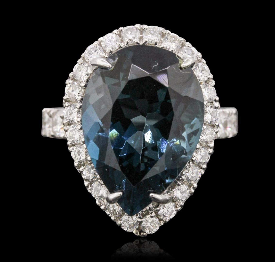 One electronically tested 14KT white gold ladies combination cast & assembled ring with a bright polish finish. Condition is new. Identified with markings of "14K". Containing: One prong set pear modified brilliant cut natural blue topaz, measuring 18.00 x 13.52 x 9.00mm, approximate weight of 15.46ct., clarity is eye clean, type I, medium dark, very slightly grayish, greenish blue color, (GIA gB 6/3), cut is good. Twenty-Four prong set round brilliant cut diamonds, measuring 1.90 - 1.90 x 1.14mm (depth est.) approximate total weight of 24 Stones = 0.60ct. Clarity: SI-2 to SI-3. Color: J, Cut is Good. Eight prong set round brilliant cut diamonds, measuring 3.00 - 3.00 x 1.80mm (depth est.) approximate total weight of 8 Stones = 0.79ct. Clarity: SI-1 to SI-2. Color: J - K, Cut is Good. Colored gemstones are presumed to have been subjected to commonly used enhancement processes. All diamonds and colored gemstones are graded in the mounting, unless otherwise stated. Total Weight of Colored Stones 15.46ct. Total Weight of Diamonds 1.39ct. Total Weight of Ring 9.60 grams. GGL Appraised at $6,815.00.