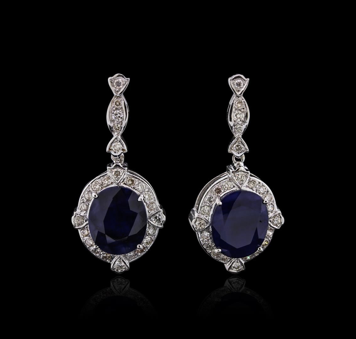 One pair electronically tested 14KT white gold ladies cast sapphire and diamond earrings with friction posts with a bright polish finish. Identified with markings of "14K". Condition is new. Containing: Two prong set oval modified brilliant cut natural blue sapphires, measuring 14.46 x 12.00 x 5.30mm, approximate total weight of 15.46ct., clarity is heavily included, type II, dark, moderately strong, blue color, (GIA B 7/4), cut is good. Fifty prong set round brilliant cut diamonds, measuring 2.20 - 2.00 x 1.26mm (depth est.) approximate total weight of 50 Stones = 1.70ct. Clarity: SI-2 to I-2. Color: I - J, Cut is Good. Diamonds and colored gemstones are graded in the mounting, unless otherwise stated. Colored gemstones are presumed to have been subjected to commonly used enhancement processes. Total Weight of Colored Stones 15.46ct. Total Weight of Diamonds 1.70ct. Total Weight of Earrings 13.20 grams. GGL Appraised at $4,210.00.