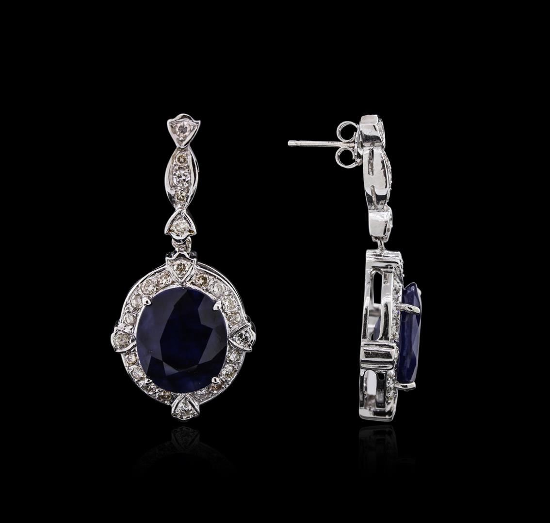 One pair electronically tested 14KT white gold ladies cast sapphire and diamond earrings with friction posts with a bright polish finish. Identified with markings of "14K". Condition is new. Containing: Two prong set oval modified brilliant cut natural blue sapphires, measuring 14.46 x 12.00 x 5.30mm, approximate total weight of 15.46ct., clarity is heavily included, type II, dark, moderately strong, blue color, (GIA B 7/4), cut is good. Fifty prong set round brilliant cut diamonds, measuring 2.20 - 2.00 x 1.26mm (depth est.) approximate total weight of 50 Stones = 1.70ct. Clarity: SI-2 to I-2. Color: I - J, Cut is Good. Diamonds and colored gemstones are graded in the mounting, unless otherwise stated. Colored gemstones are presumed to have been subjected to commonly used enhancement processes. Total Weight of Colored Stones 15.46ct. Total Weight of Diamonds 1.70ct. Total Weight of Earrings 13.20 grams. GGL Appraised at $4,210.00.