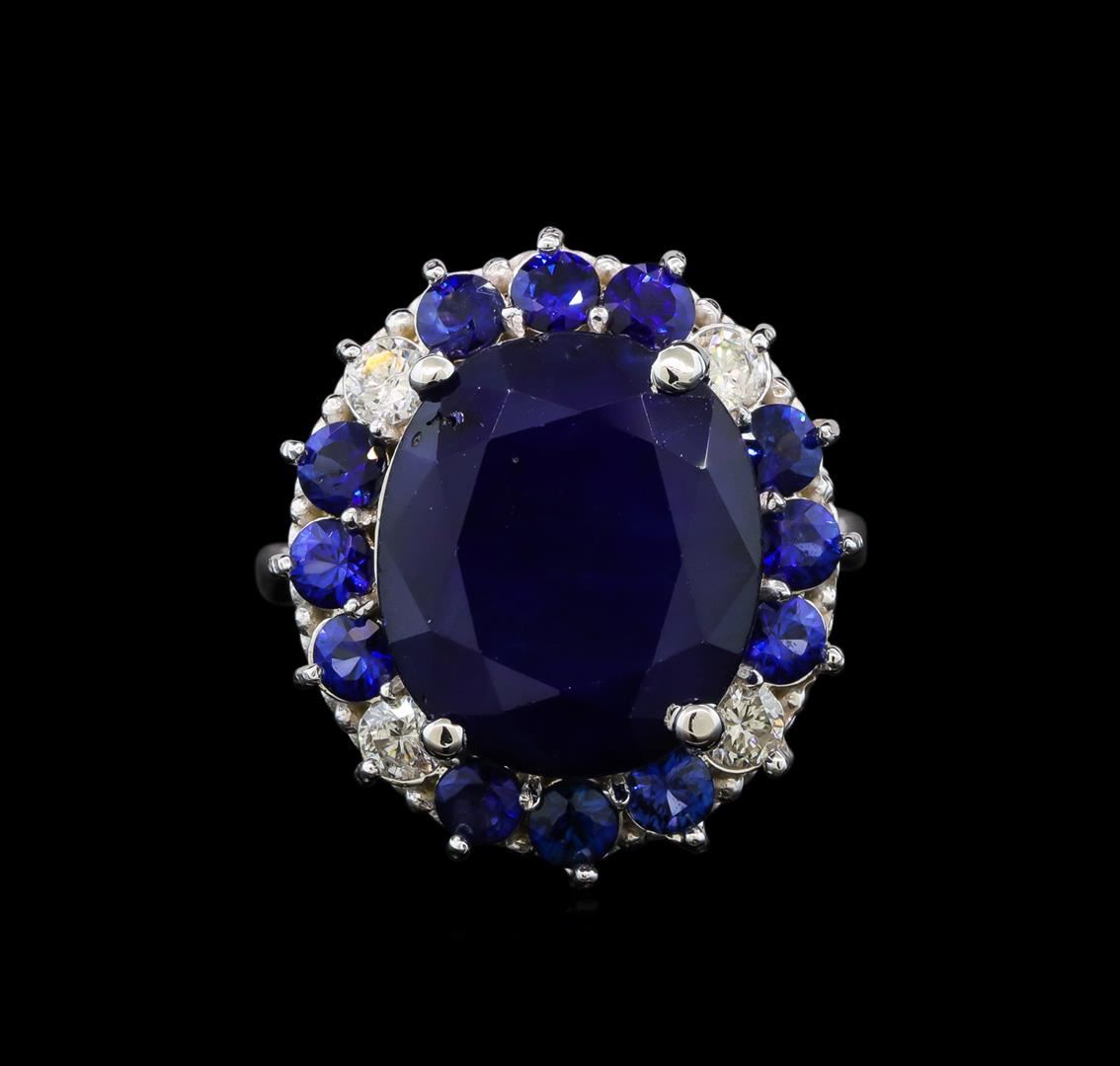 One electronically tested 14KT white gold ladies cast sapphire and diamond ring with a bright polish finish. Identified with markings of "14K". Condition is new. Containing: One prong set oval modified brilliant cut natural blue sapphire, measuring 15.00. x 13.00. x 8.45mm, approximate weight of 13.84ct., clarity is heavily included, type II, dark, strong, blue color, (GIA B 7/5), cut is good. Twelve prong set round modified brilliant cut natural blue sapphires, measuring 3.00. - 3.00. x 1.95 mm, approximate total weight of 1.68ct., clarity is eye clean, type II, medium, moderately strong, blue color, (GIA B 5/4), cut is good. Four prong set round brilliant cut diamonds, measuring 3.00. - 3.00. x 1.80mm (depth est.) approximate total weight of 4 Stones = 0.40ct. Clarity: SI-2 to I-1. Color: I - J, Cut is Good. Colored gemstones are presumed to have been subjected to commonly used enhancement processes. All diamonds and colored gemstones are graded in the mounting, unless otherwise stated. Total Weight of Colored Stones 15.52ct. Total Weight of Diamonds 0.40ct. Total Weight of Ring 9.80 grams. GGL Appraised at $4,010.00.