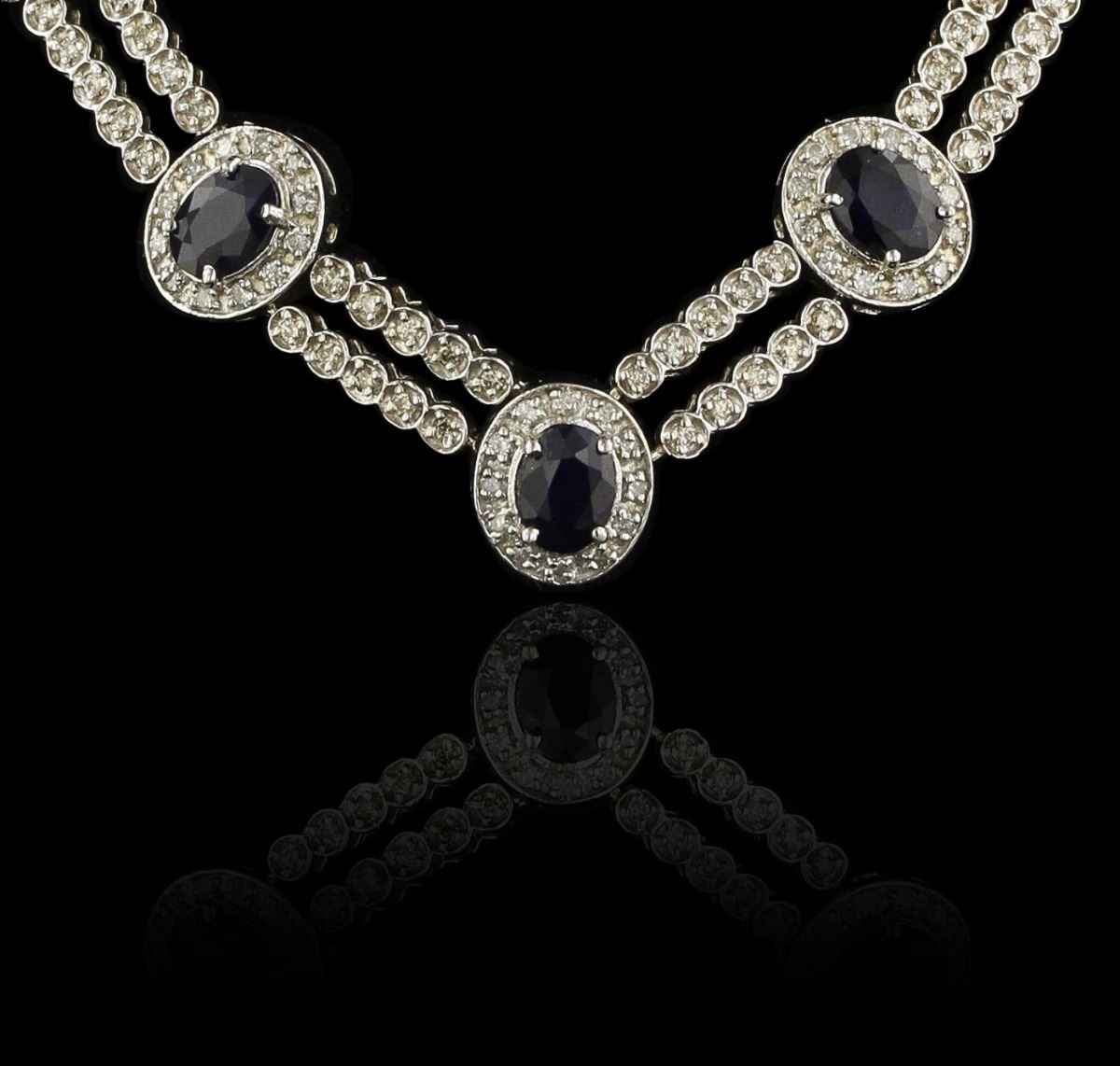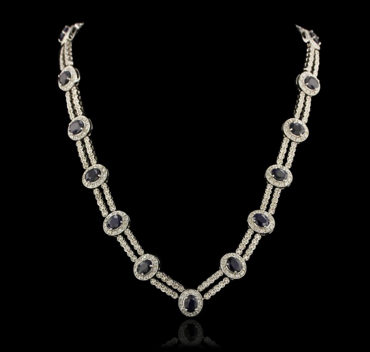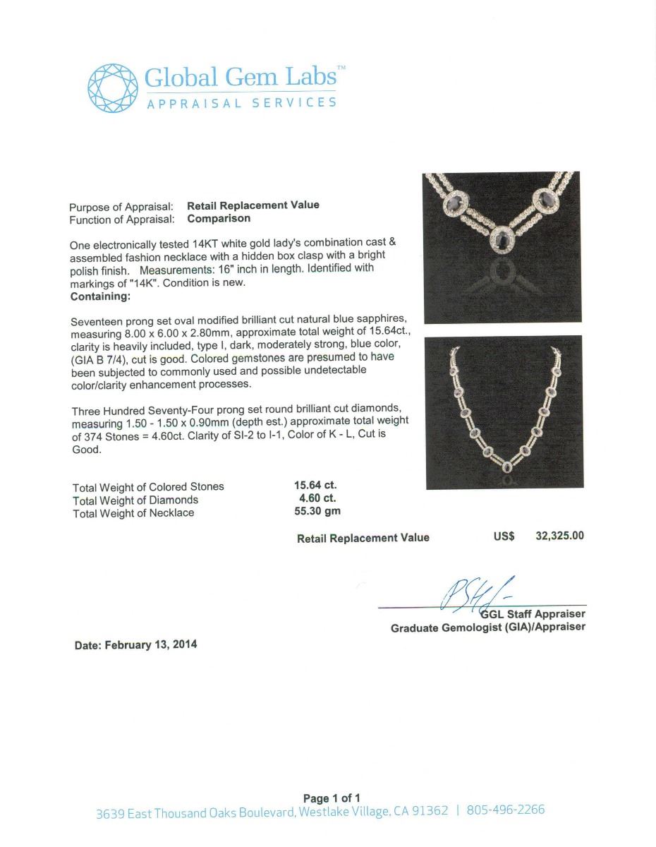 One electronically tested 14KT White Gold Ladies combination cast & assembled fashion necklace with a hidden box clasp with a bright polish finish. Condition is new. Measurements: 16" inch in length. Identified with markings of "14K". Containing: Seventeen prong set oval modified brilliant cut natural blue sapphires, measuring 8.00 x 6.00 x 2.80mm, approximate total weight of 15.64ct., clarity is heavily included, type I, dark, moderately strong, blue color, (GIA B 7/4), cut is good. Colored gemstones are presumed to have been subjected to commonly used and possible undetectable color/clarity enhancement processes. Three Hundred Seventy-Four prong set round brilliant cut diamonds, measuring 1.50 - 1.50 x 0.90mm (depth est.) approximate total weight of 374 Stones = 4.60ct. Clarity of SI-2 to I-1, Color of K - L, Cut is Good. Total Weight of Colored Stones 15.64ct. Total Weight of Diamonds 4.60ct. Total Weight of Necklace 55.30gm. GGL Appraised at $32,325.00.