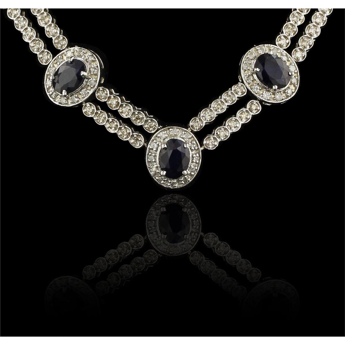 One electronically tested 14KT White Gold Ladies combination cast & assembled fashion necklace with a hidden box clasp with a bright polish finish. Condition is new. Measurements: 16" inch in length. Identified with markings of "14K". Containing: Seventeen prong set oval modified brilliant cut natural blue sapphires, measuring 8.00 x 6.00 x 2.80mm, approximate total weight of 15.64ct., clarity is heavily included, type I, dark, moderately strong, blue color, (GIA B 7/4), cut is good. Colored gemstones are presumed to have been subjected to commonly used and possible undetectable color/clarity enhancement processes. Three Hundred Seventy-Four prong set round brilliant cut diamonds, measuring 1.50 - 1.50 x 0.90mm (depth est.) approximate total weight of 374 Stones = 4.60ct. Clarity of SI-2 to I-1, Color of K - L, Cut is Good. Total Weight of Colored Stones 15.64ct. Total Weight of Diamonds 4.60ct. Total Weight of Necklace 55.30gm. GGL Appraised at $32,325.00.