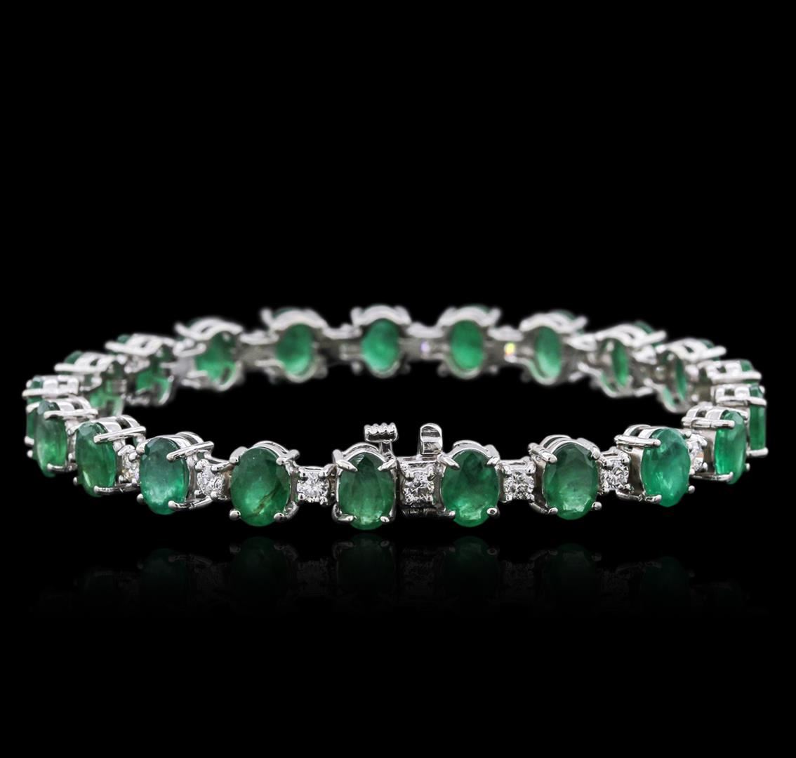 One electronically tested 14KT white gold ladies cast emerald and diamond bracelet with a hidden box clasp with a bright polish finish. Measurements: 7 inches in length. Identified with markings of "14K". Condition is new. Containing: Twenty-one prong set oval modified brilliant cut natural emeralds, measuring 6.80 x 5.00. x 3.25mm, approximate total weight of 15.83ct., clarity is moderately included, type III, medium, moderately strong, green color, (GIA G 5/4), cut is good. Twenty-One prong set round brilliant cut diamonds, measuring 2.50 - 2.50 x 1.50mm (depth est.) approximate total weight of 21 Stones = 1.52ct. Clarity: SI-1 to I-1. Color: I - J, Cut is Good. Colored gemstones are presumed to have been subjected to commonly used enhancement processes. All diamonds and colored gemstones are graded in the mounting, unless otherwise stated. Total Weight of Colored Stones 15.83ct. Total Weight of Diamonds 1.52ct. Total Weight of Bracelet 18.60 grams. GGL Appraised at $8,255.00.