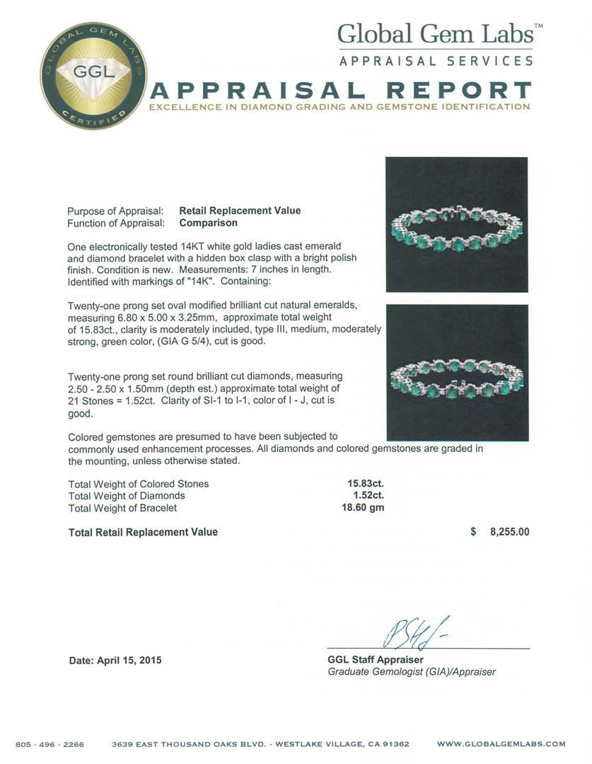 One electronically tested 14KT white gold ladies cast emerald and diamond bracelet with a hidden box clasp with a bright polish finish. Measurements: 7 inches in length. Identified with markings of "14K". Condition is new. Containing: Twenty-one prong set oval modified brilliant cut natural emeralds, measuring 6.80 x 5.00. x 3.25mm, approximate total weight of 15.83ct., clarity is moderately included, type III, medium, moderately strong, green color, (GIA G 5/4), cut is good. Twenty-One prong set round brilliant cut diamonds, measuring 2.50 - 2.50 x 1.50mm (depth est.) approximate total weight of 21 Stones = 1.52ct. Clarity: SI-1 to I-1. Color: I - J, Cut is Good. Colored gemstones are presumed to have been subjected to commonly used enhancement processes. All diamonds and colored gemstones are graded in the mounting, unless otherwise stated. Total Weight of Colored Stones 15.83ct. Total Weight of Diamonds 1.52ct. Total Weight of Bracelet 18.60 grams. GGL Appraised at $8,255.00.