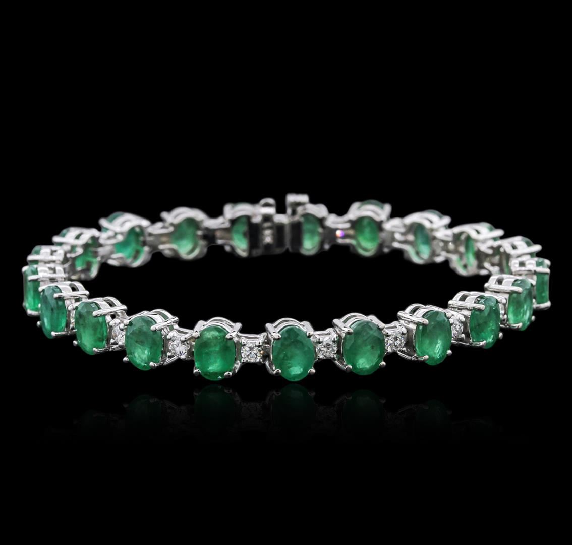 One electronically tested 14KT white gold ladies cast emerald and diamond bracelet with a hidden box clasp with a bright polish finish. Measurements: 7 inches in length. Identified with markings of "14K". Condition is new. Containing: Twenty-one prong set oval modified brilliant cut natural emeralds, measuring 6.80 x 5.00. x 3.25mm, approximate total weight of 15.83ct., clarity is moderately included, type III, medium, moderately strong, green color, (GIA G 5/4), cut is good. Twenty-One prong set round brilliant cut diamonds, measuring 2.50 - 2.50 x 1.50mm (depth est.) approximate total weight of 21 Stones = 1.52ct. Clarity: SI-1 to I-1. Color: I - J, Cut is Good. Colored gemstones are presumed to have been subjected to commonly used enhancement processes. All diamonds and colored gemstones are graded in the mounting, unless otherwise stated. Total Weight of Colored Stones 15.83ct. Total Weight of Diamonds 1.52ct. Total Weight of Bracelet 18.60 grams. GGL Appraised at $8,255.00.