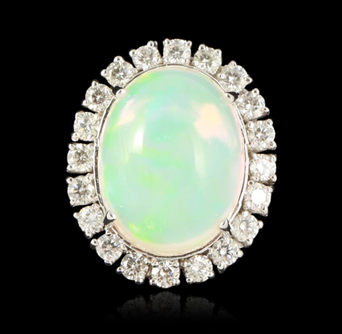 One electronically tested 14KT white gold ladies cast opal & diamond ring with a bright finish. The featured opal is set within a diamond bezel, supported by a ribbed under gallery, completed by a three millimeter wide band. Identified with markings of "14K". Condition is good. Containing: One white jelly opal that is cut in an oval shaped cabochon and is prong set, measuring 18.00mm x 14.00mm x 9.72mm, and the approximate weight is 15.88 carats. The opal has a bright, green play of color (fire) in a broad flashfire pattern; a high dome; a good cut; no inclusions; slight variation in base in its brightness and pattern; and is somewhat directional. Graded in the setting. Twenty prong set round brilliant cut diamonds, measuring 2.70 - 2.60 x 1.59mm (depth est.) approximate total weight of 20 Stones = 1.46ct. Graded in the setting. Clarity: VS-2 Average. Color: F - H. Total Weight of Opal: 15.88ct. Total Weight of Diamonds: 1.46ct. Total Weight of Ring: 9.56 grams. AIG Appraised at $10,440.00.