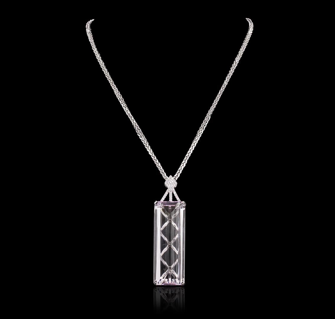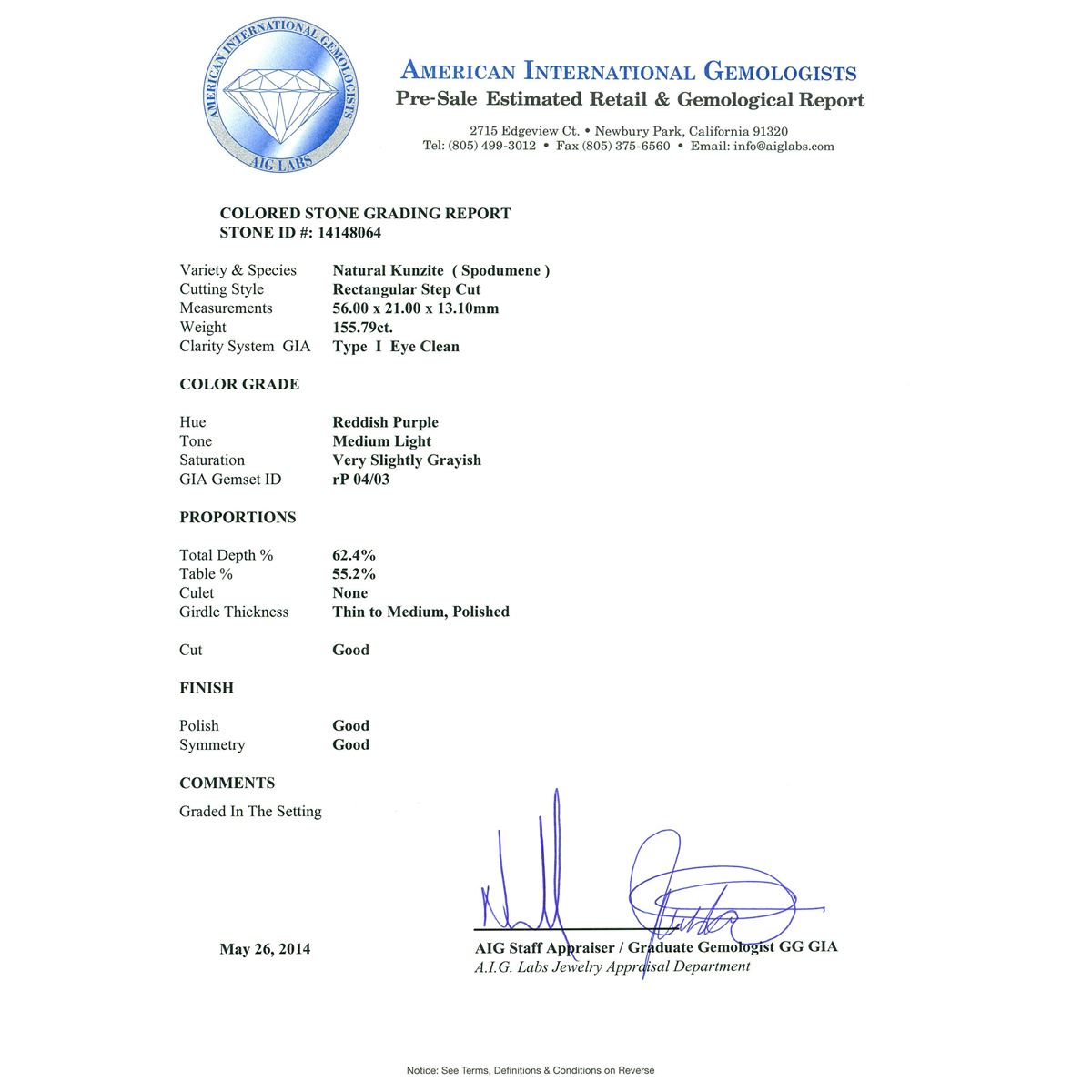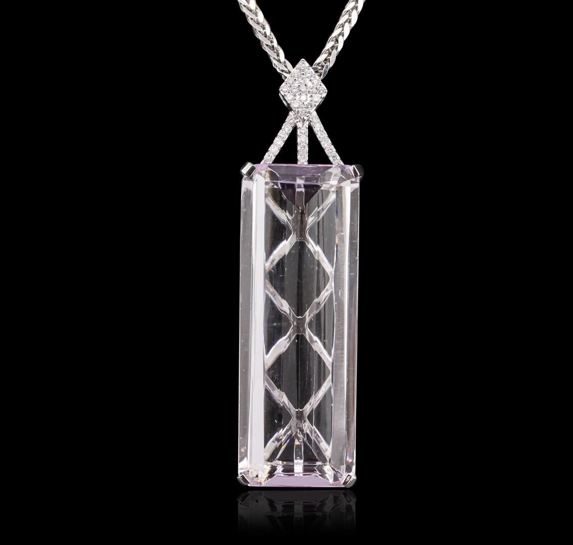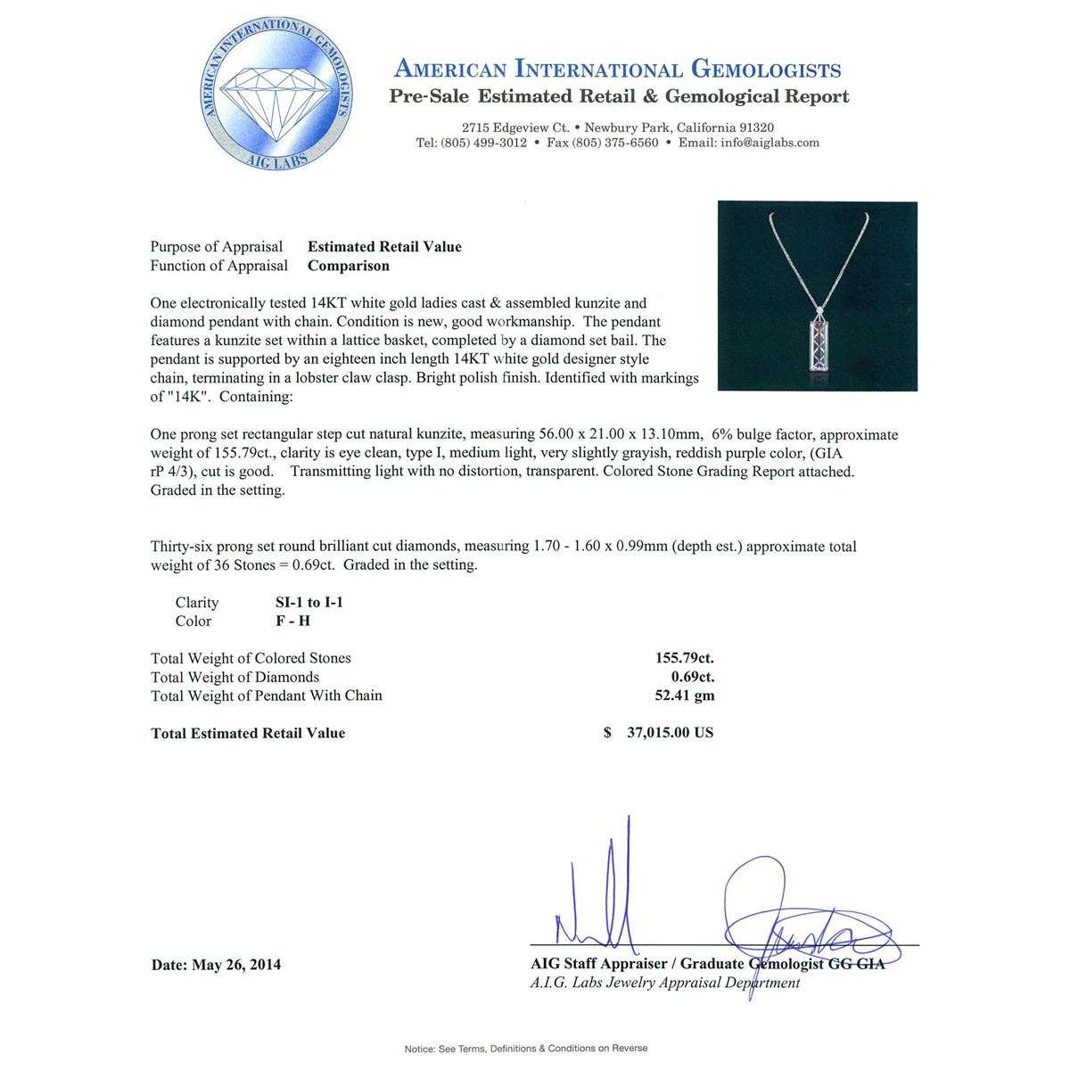 One electronically tested 14KT white gold ladies cast & assembled kunzite and diamond pendant with chain. Condition is new, good workmanship. The pendant features a kunzite set within a lattice basket, completed by a diamond set bail. The pendant is supported by an eighteen inch length 14KT white gold designer style chain, terminating in a lobster claw clasp. Bright polish finish. Identified with markings of "14K". Containing: One prong set rectangular step cut natural kunzite, measuring 56.00 x 21.00 x 13.10mm, 6%. bulge factor, approximate weight of 155.79ct., clarity is eye clean, type I, medium light, very slightly grayish, reddish purple color, (GIA rP 4/3), cut is good. Transmitting light with no distortion, transparent. Colored Stone Grading Report attached. Graded in the setting. Thirty-Six prong set round brilliant cut diamonds, measuring 1.70 - 1.60 x 0.99mm (depth est.) approximate. Total Weight of 36 Stones = 0.69ct. Graded in the setting. Clarity: SI-1 to I-1. Color: F - H. Total Weight of Colored Stones155.79ct. Total Weight of Diamonds 0.69ct. Total Weight of Pendant With Chain 52.41 grams. AIG Appraised at $37,015.00.