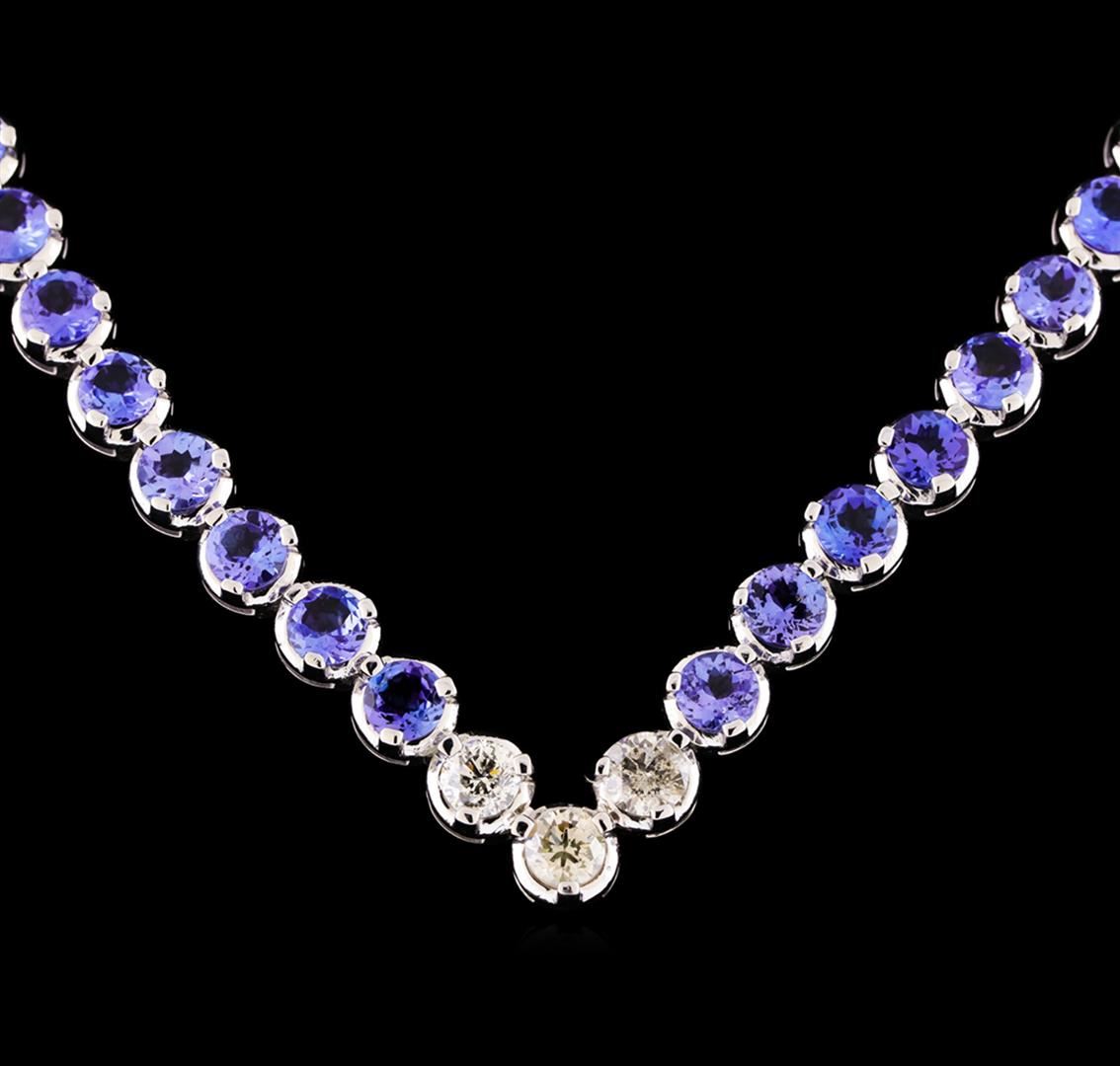 One electronically tested 14KT white gold ladies combination cast & assembled tanzanite and diamond necklace with a hidden box clasp with safety closer with a bright polish finish. Identified with markings of "14K". Condition is new. Containing: Twenty-four prong set round modified brilliant cut natural tanzanites, measuring 5.46 - 5.38 x 3.35 mm, approximate total weight of 16.08ct., clarity is eye clean, type I, medium light, very slightly grayish, violet color, (GIA V 4/3), cut is good. Three prong set round brilliant cut diamonds, measuring 5.50 - 5.15 x 3.20mm (depth est.) approximate total weight of 3 Stones = 1.66ct. Clarity: I-1 to I-2. Color: K - L, Cut is Good. All diamonds and colored gemstones are graded in the mounting, unless otherwise stated. Colored gemstones are presumed to have been subjected to commonly used enhancement processes. Total Weight of Colored Stones 16.08ct. Total Weight of Diamonds 1.66ct. Total Weight of Necklace 34.19 grams. GGL Appraised at $13,020.00.